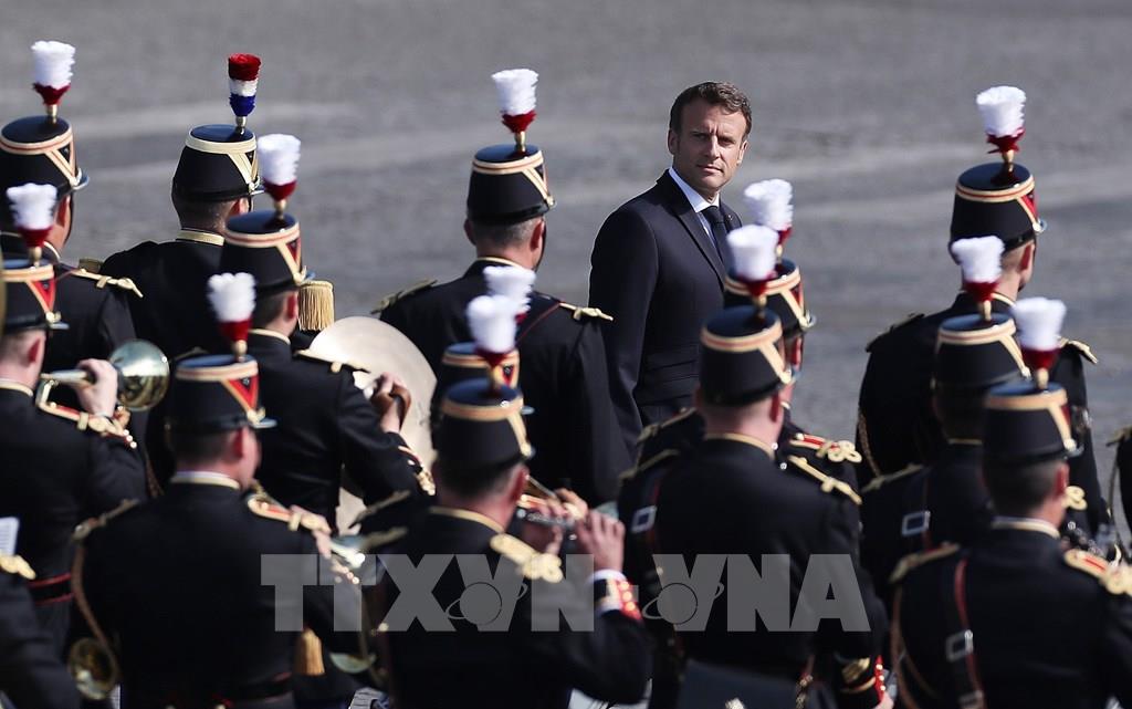 Tổng thống Pháp Emmanuel Macron (giữa) dự lễ diễu binh nhân ngày Quốc khánh tại thủ đô Paris, ngày 14/7/2022. Ảnh: THX/TTXVN