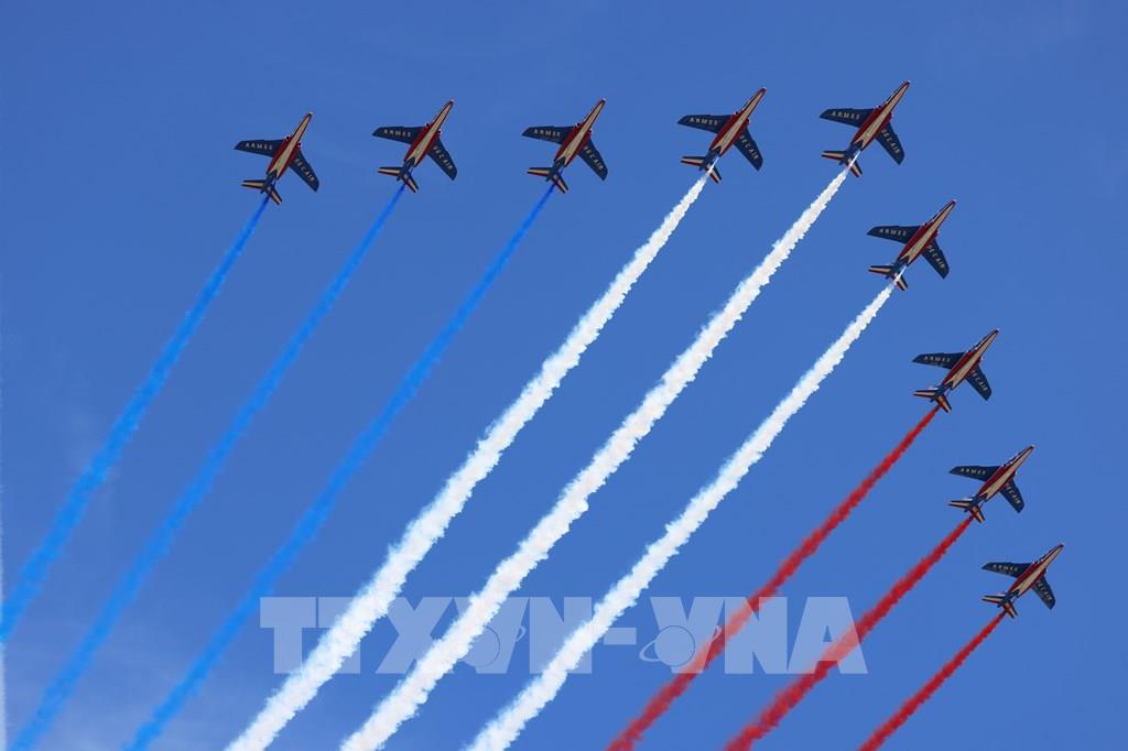 Đội hình máy bay của không lực Pháp bay trình diễn nhân kỷ niệm ngày Quốc khánh tại thủ đô Paris, ngày 14/7/2022. Ảnh: THX/TTXVN