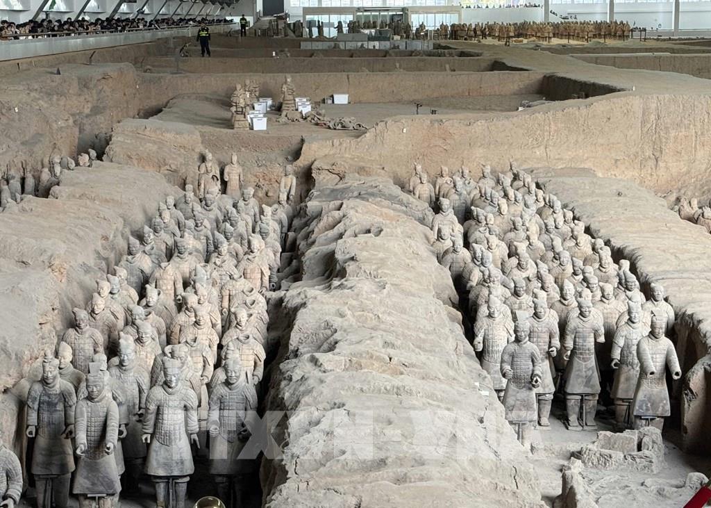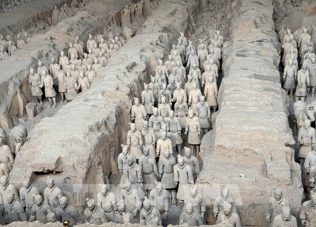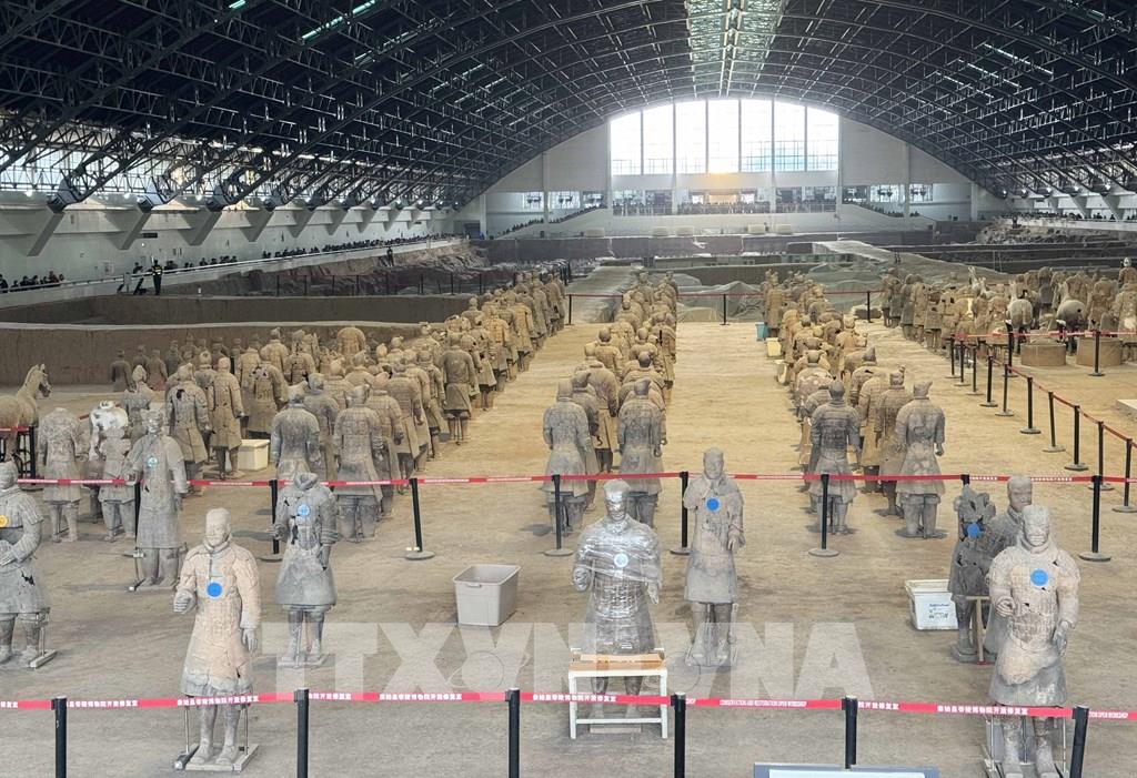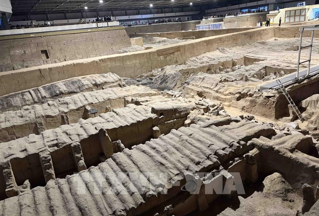 Khu hầm mộ số 1 có diện tích khoảng 14.260 m2, đây là chiến trường chính, chứa khoảng 6.000 chiến binh đất nung, ngựa và xe ngựa, thể hiện cảnh tượng ngoạn mục của bộ binh và xe ngựa chiến đấu cùng nhau. Ảnh: Công Tuyên-PV TTXVN