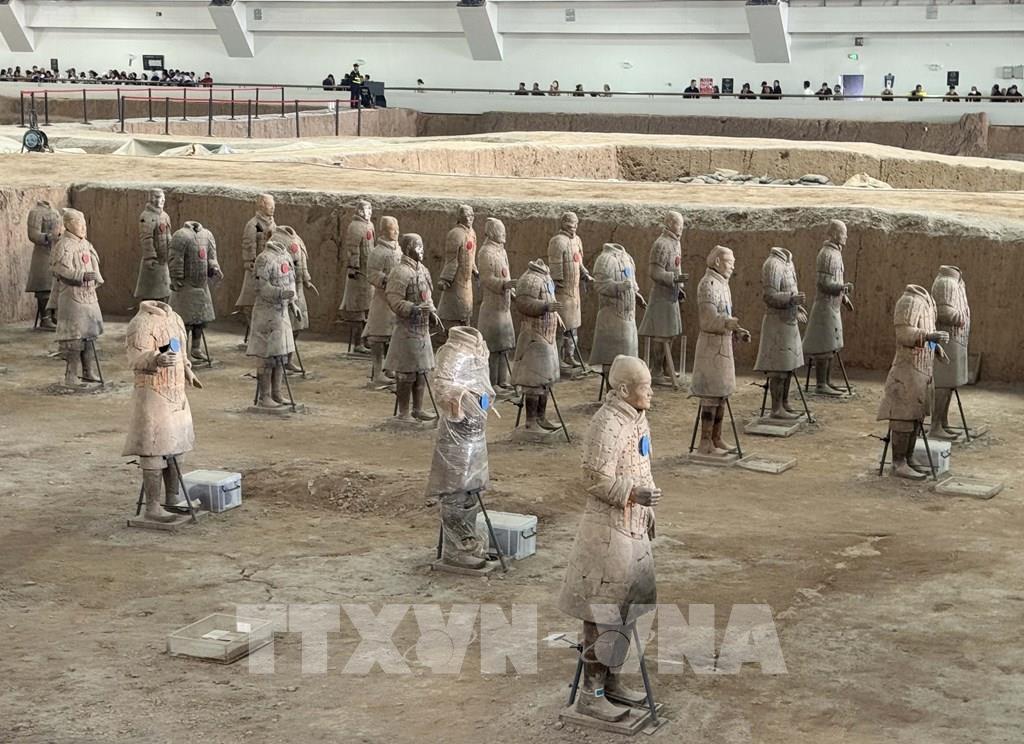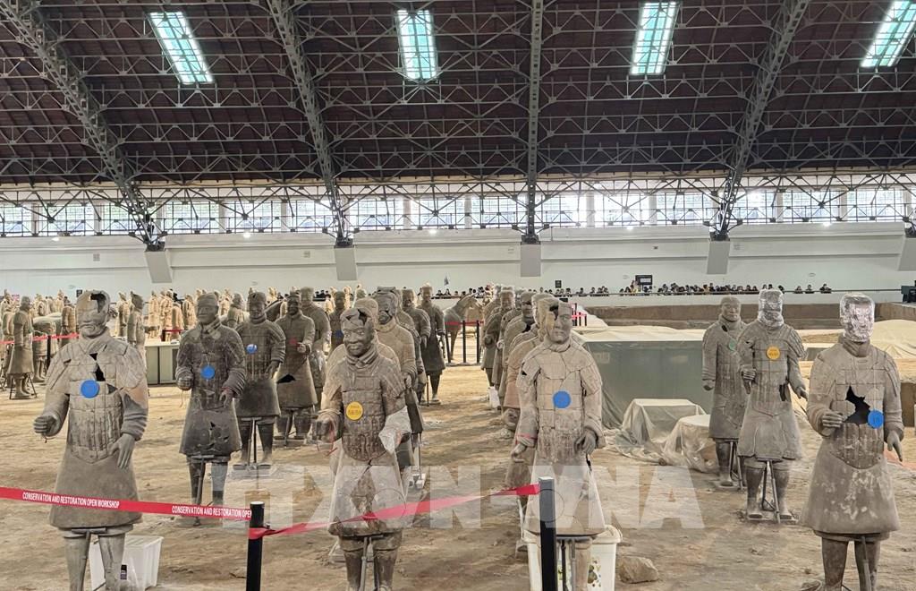Các bức tượng Binh Mã Dõng đang trong quá trình phục chế lại. Ảnh: Công Tuyên-PV TTXVN