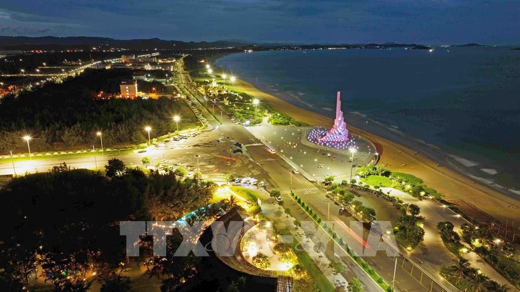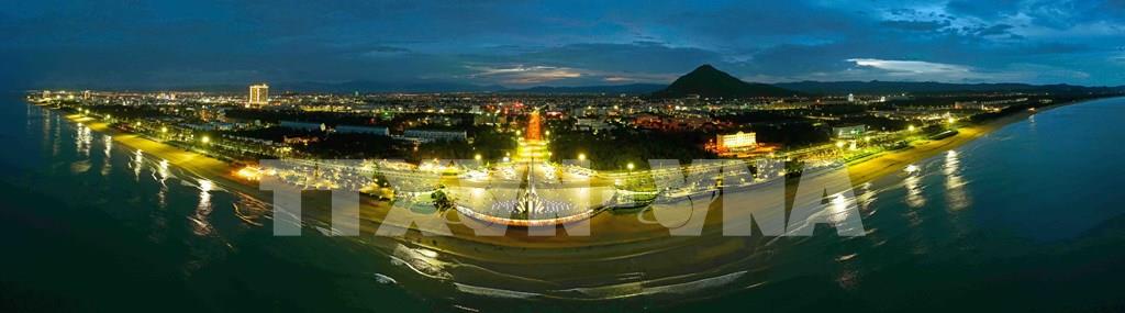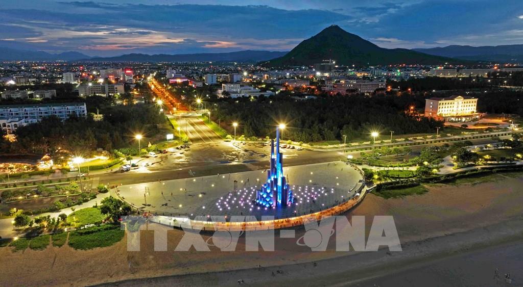 Tháp Nghinh Phong trong khuôn viên công viên biển ở thành phố Tuy Hoà, tỉnh Phú Yên, rực rỡ về đêm. Ảnh: Vũ Sinh – TTXVN