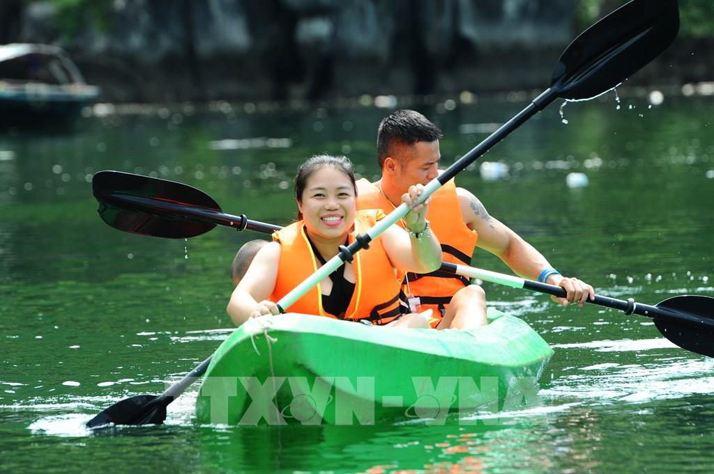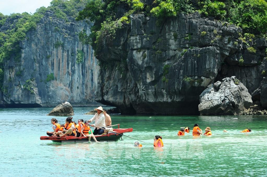 Khách khám phá Cát Bà bằng thuyền và có thể tắm biển bất cứ lúc nào. Ảnh: Minh Đức - TTXVN