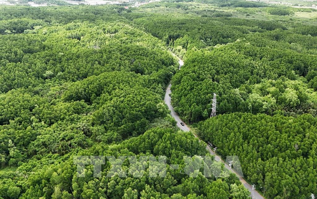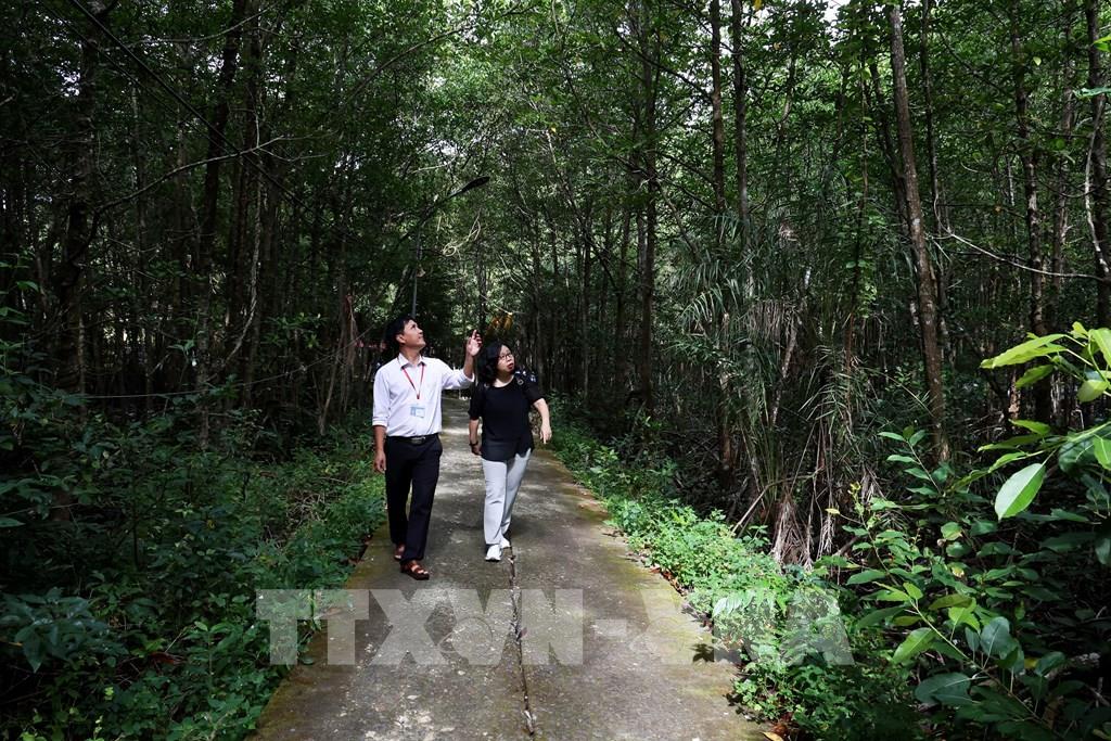 Con đường vào khu du lịch Vàm Sát (xã Lý Nhơn, huyện Cần Giờ) phủ kín bởi màu xanh của rừng đước. Ảnh: Hồng Đạt - TTXVN