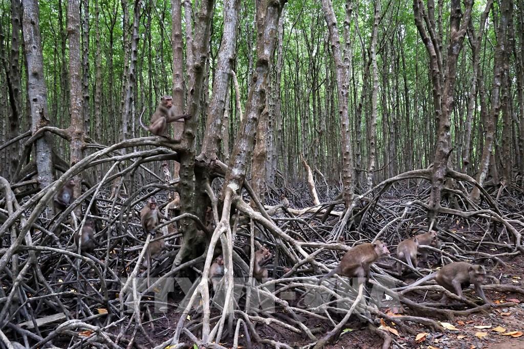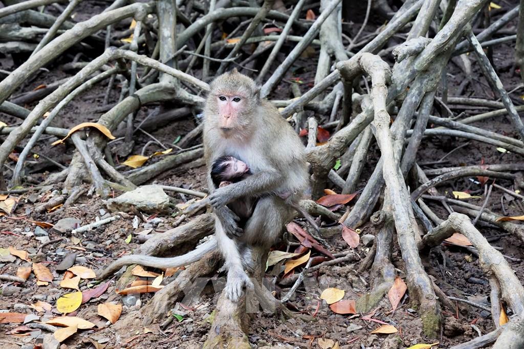 Loài khỉ đuôi dài có nhiều trong rừng ngập mặn Cần Giờ. Ảnh: Hồng Đạt - TTXVN
