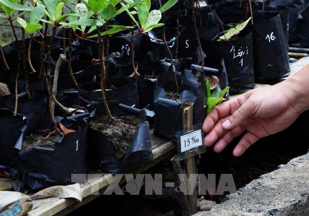 Xác định độ mặn khi ươm các giống cây rừng ngập mặn. Ảnh: Huyền Trinh - TTXVN