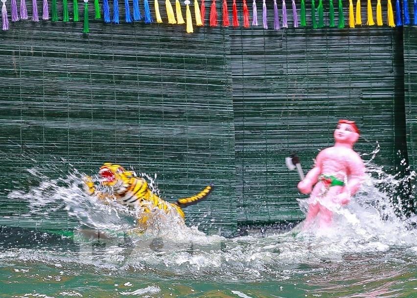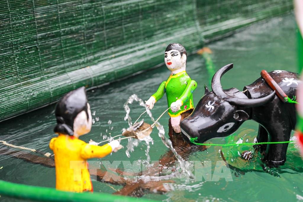 Các tiết mục rối nước thường mô tả cuộc sống lao động sản xuất nông nghiệp, các lễ hội truyền thống hay những câu chuyện cổ tích, truyền thuyết dân gian, mang đậm ước mơ về một cuộc sống ấm no, hạnh phúc. Ảnh: Khánh Hoà - TTXVN