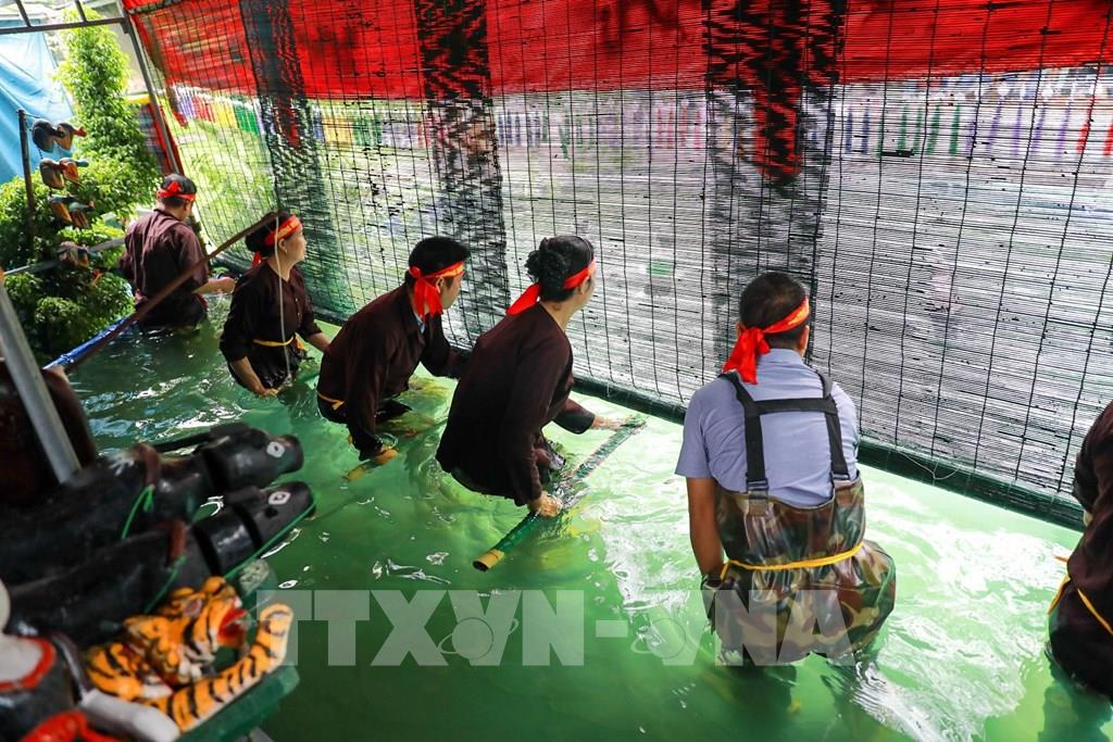 Các nghệ nhân đứng trong buồng trò (thủy đình) được che chắn kỹ lưỡng, sử dụng sào, dây và bộ máy điều khiển ẩn dưới mặt nước để làm cho con rối cử động, di chuyển một cách sống động như thật. Ảnh: Khánh Hoà - TTXVN