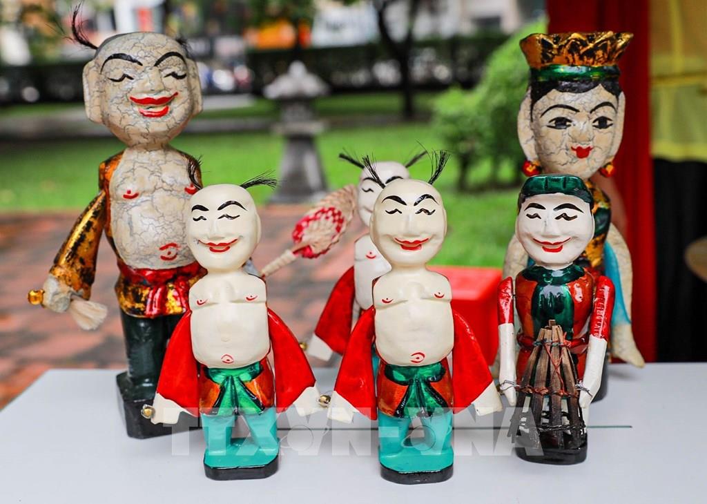 Con rối được làm bằng gỗ và sơn mài, có hình dáng và màu sắc đa dạng, thể hiện các nhân vật trong các câu chuyện dân gian hoặc cuộc sống thường ngày. Ảnh: Khánh Hoà - TTXVN