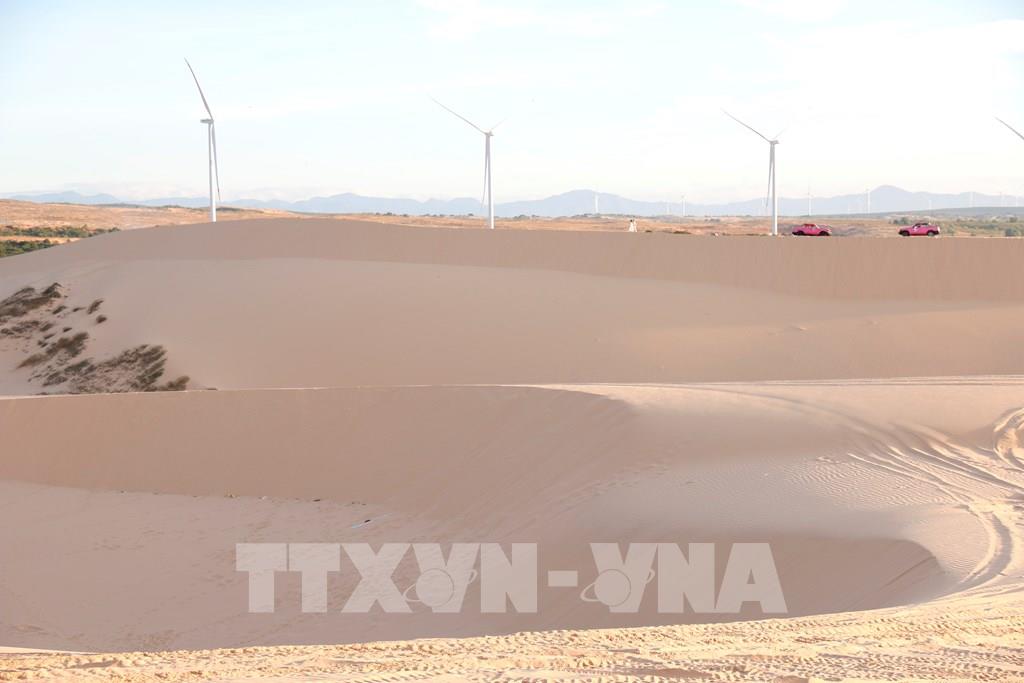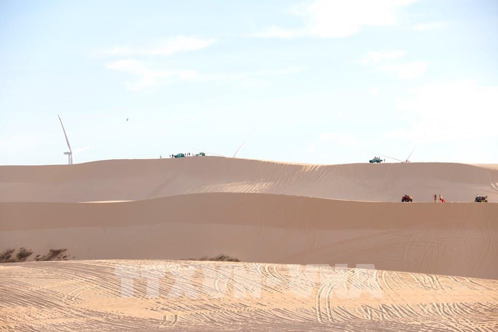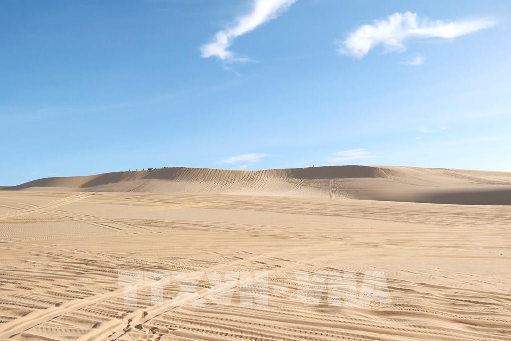 Những đồi cát cao vút trải dài với nhiều hình dạng độc đáo và thay đổi thường xuyên dưới tác động của gió, thu hút du khách khi đến tham quan Bàu Trắng. Ảnh: Nguyễn Thanh - TTXVN