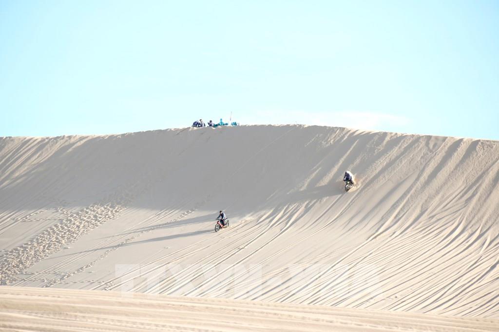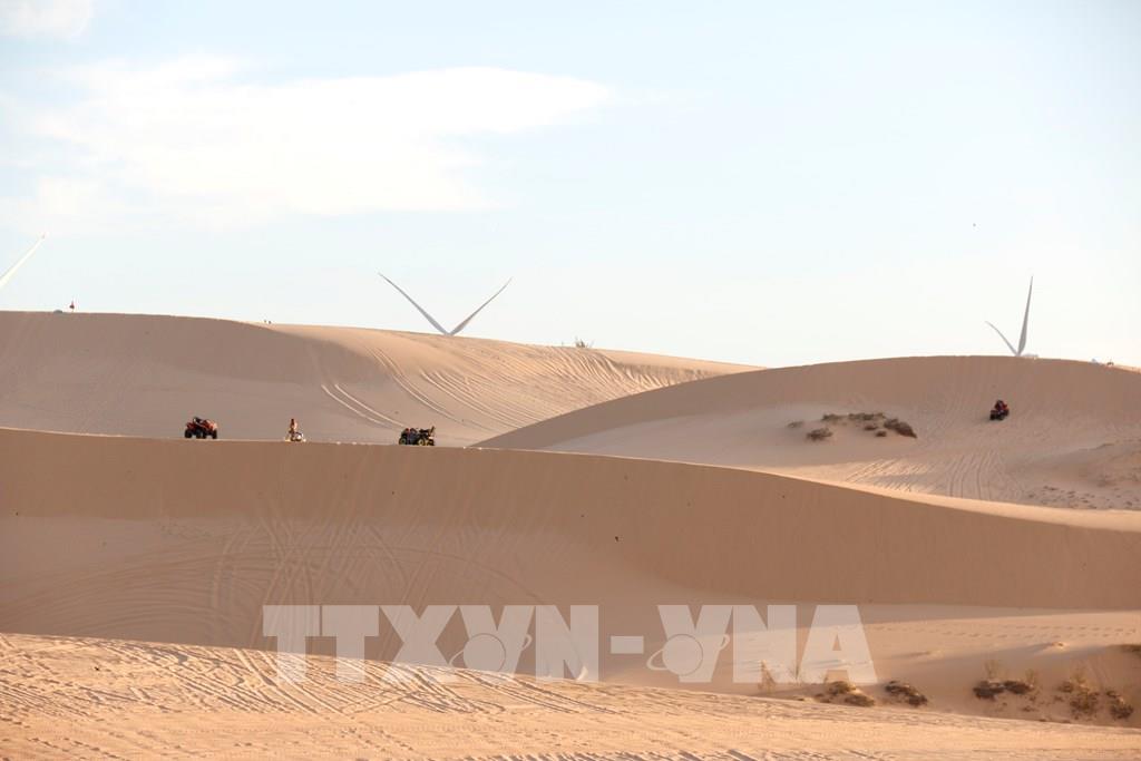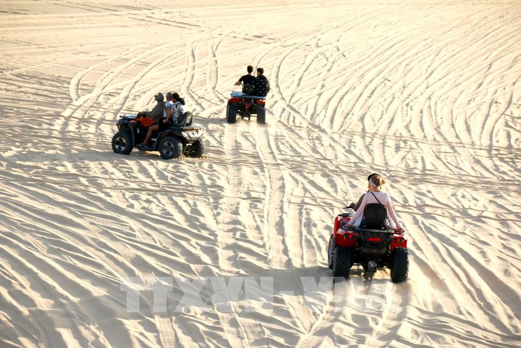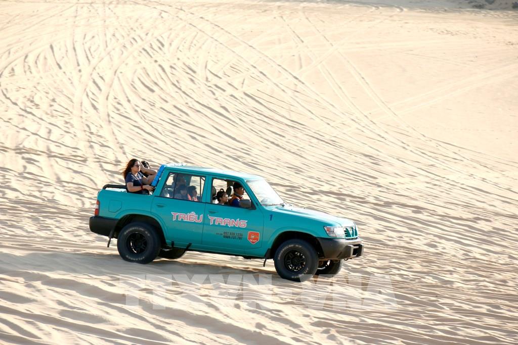Trải nghiệm đi xe địa hình vượt đồi cát Bàu Trắng, mang lại cảm giác mạnh cho du khách. Ảnh: Nguyễn Thanh - TTXVN