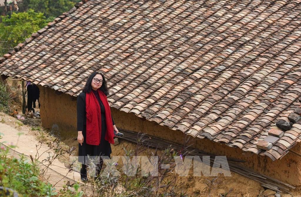 Du khách check-in với nếp nhà trình tường mái ngói âm dương. Ảnh: Thanh Thương - TTXVN