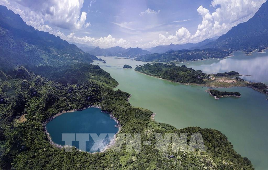 Hồ Mắt Ngọc là một hồ nước riêng biệt có khe nước ngầm kết nối với sông Đà, tuy nhiên nước hồ Mắt Ngọc luôn có màu xanh thẳm khác với màu nước của sông Đà (Hồ Hoà Bình). Ảnh: Trọng Đạt-TTXVN