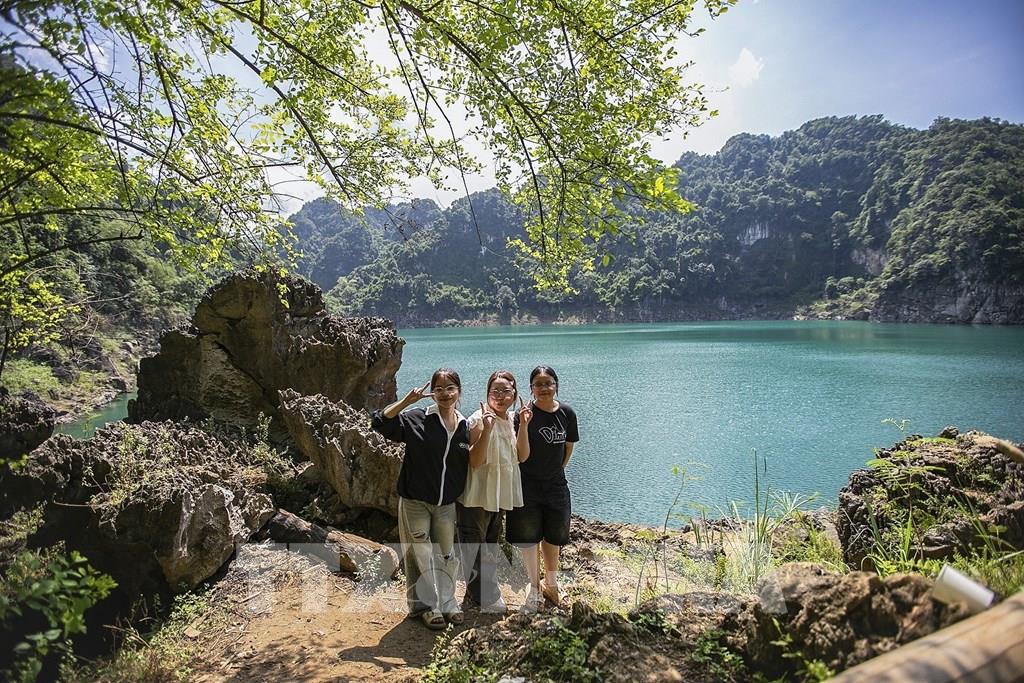 Nhóm bạn trẻ của trường THCS Hai Bà Trưng xã Hạ Bằng Hà Nội đã tự khám phá hồ Mắt Ngọc khi tự đi xe máy lên xã Mường Hoa rồi đi xuyên rừng để đến hồ Mắt Ngọc. Ảnh: Trọng Đạt-TTXVN