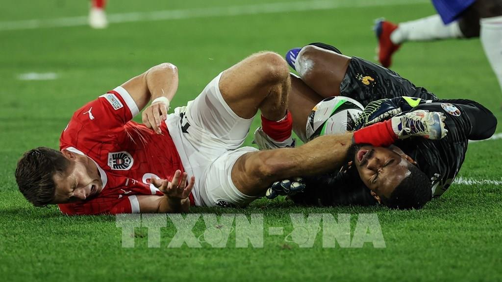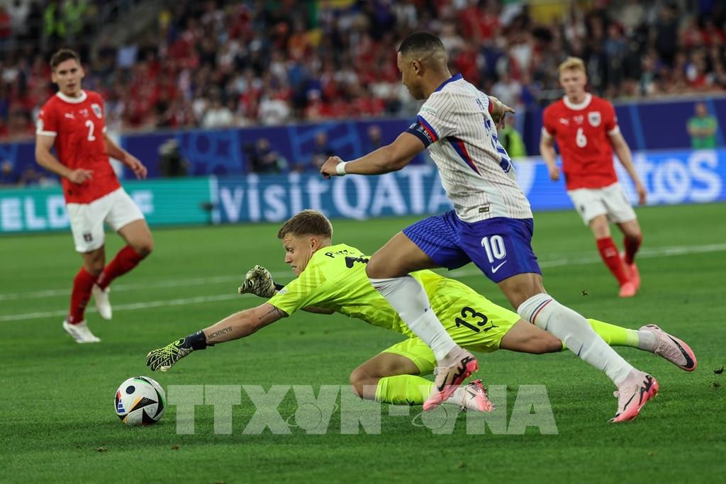 Pha va chạm giữa cầu thủ Christoph Baumgartner (trái) của Áo và thủ môn đội tuyển Pháp Mike Maignan. Ảnh: THX/TTXVN