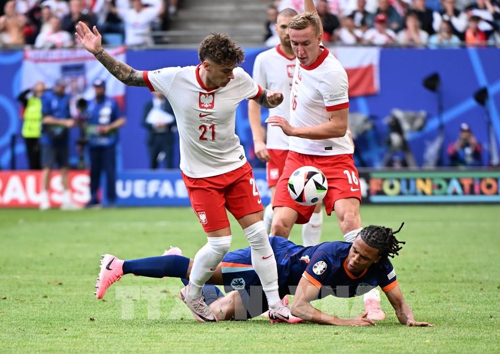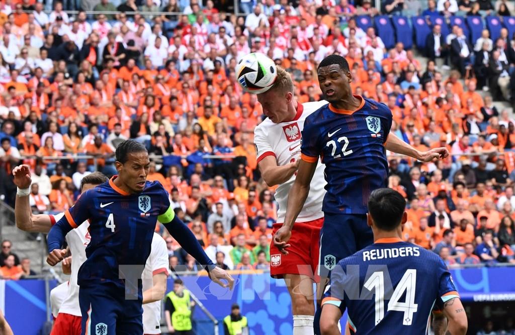 Nathan Ake (áo xanh) của Hà Lan nỗ lực tranh bóng với các cầu thủ Ba Lan. Ảnh: THX/TTXVN