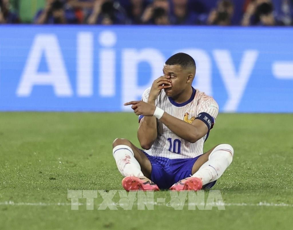 Tiền đạo tuyển Pháp Kylian Mbappe bị thương sau va chạm với hậu vệ Áo Kevin Danso ở trận ra quân bảng D, ngày 17/6/2024. Ảnh: THX/TTXVN
