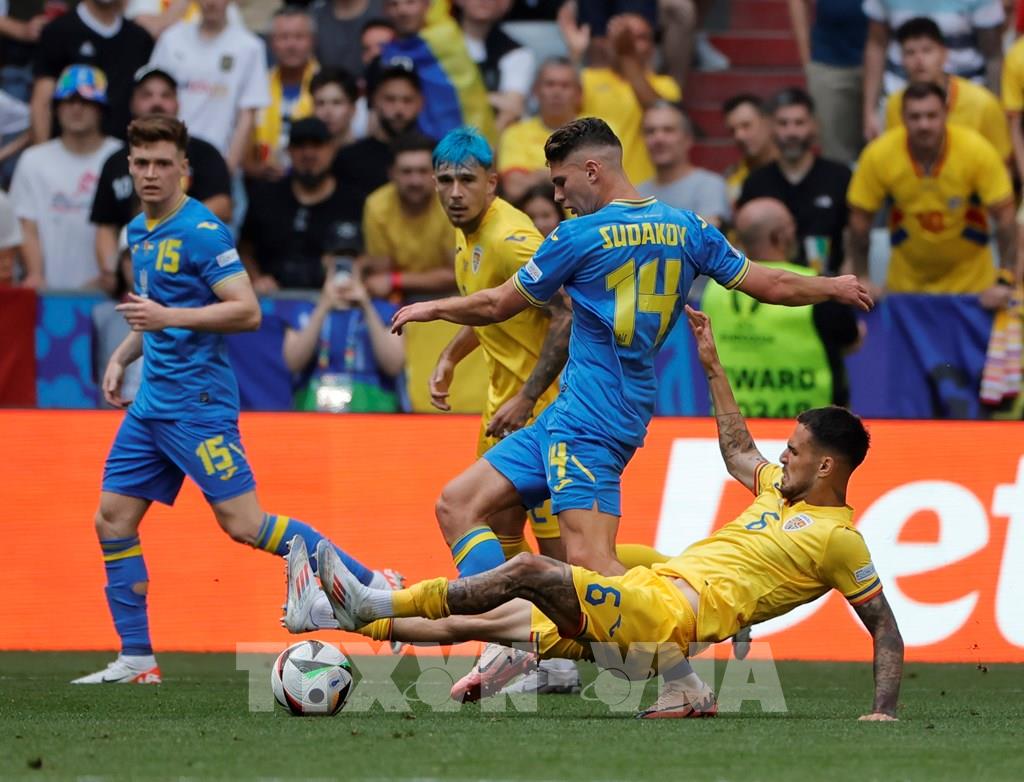 Pha tranh bóng giữa tiền vệ Georgiy Sudakov (số 14) của Ukraine với tiền vệ Marius Marin của Romania. Ảnh: THX/TTXVN