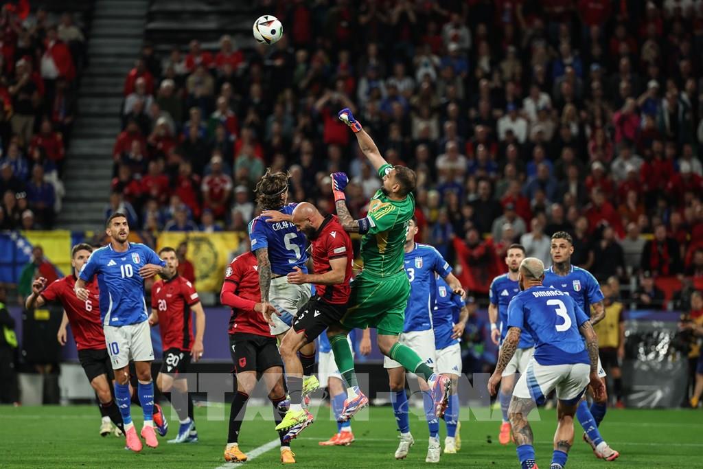 Thủ thành Italy Gianluigi Donnarumma nỗ lực phá bóng, cứu nguy. Ảnh: THX/TTXVN