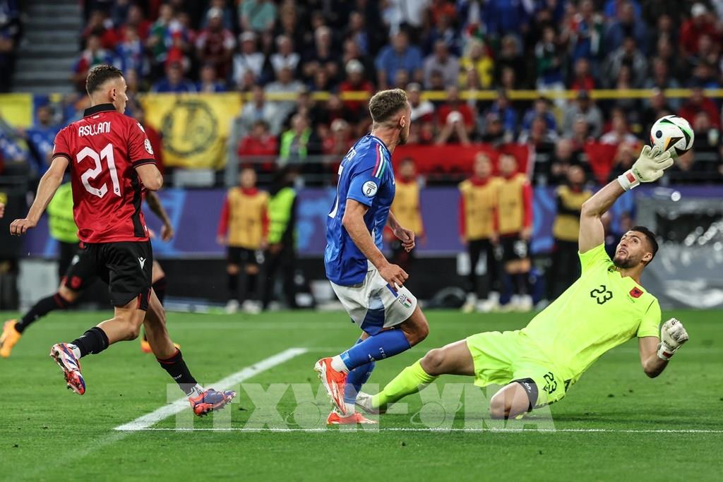 Tiền vệ Italy Davide Frattesi (giữa) sút bóng về phía khung thành tuyển Albania. Ảnh: THX/TTXVN