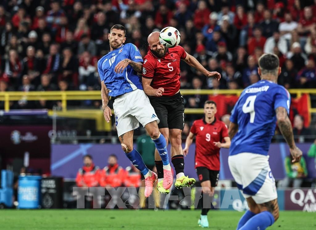 Tiền vệ Italy Gianluca Scamacca (trái) nỗ lực tranh bóng bổng với Arlind Ajeti, hậu vệ tuyển Albania. Ảnh: THX/TTXVN