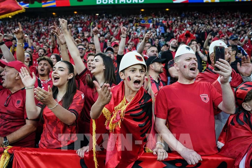 Cổ động viên Albani cổ vũ đội nhà trong trận gặp tuyển Italy ở Dortmund (Đức) ngày 15/6/2024. Ảnh: THX/TTXVN