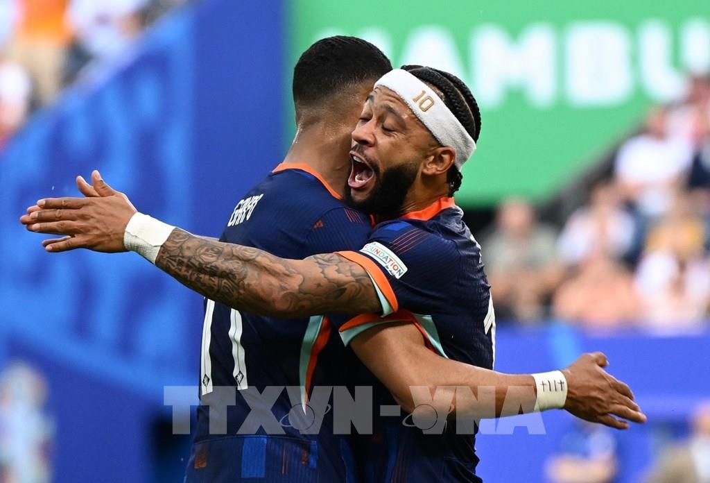 Cody Gakpo (trái) của Hà Lan cùng đồng đội ăn mừng bàn thắng gỡ hòa 1-1 trước Ba Lan ở phút 29. Ảnh: THX/TTXVN