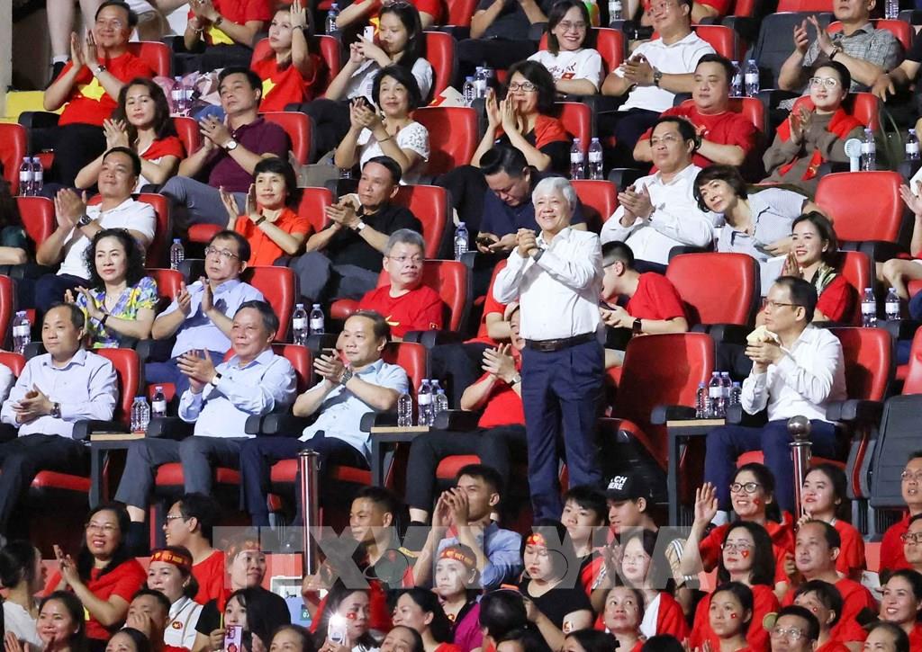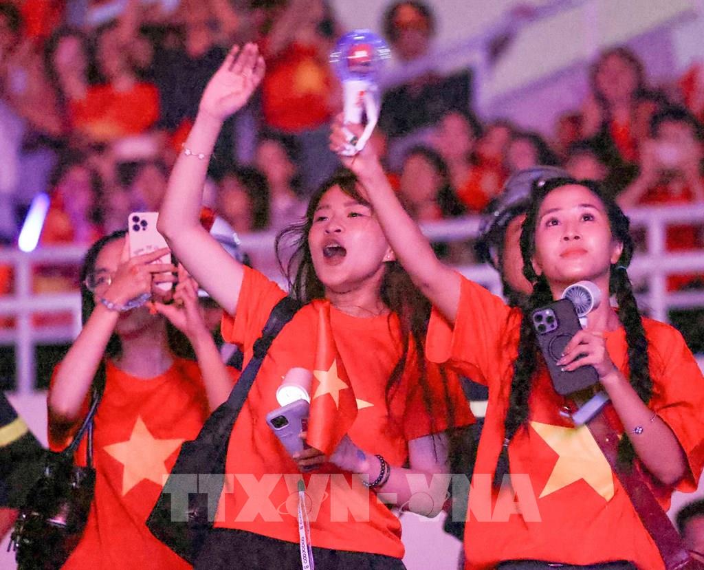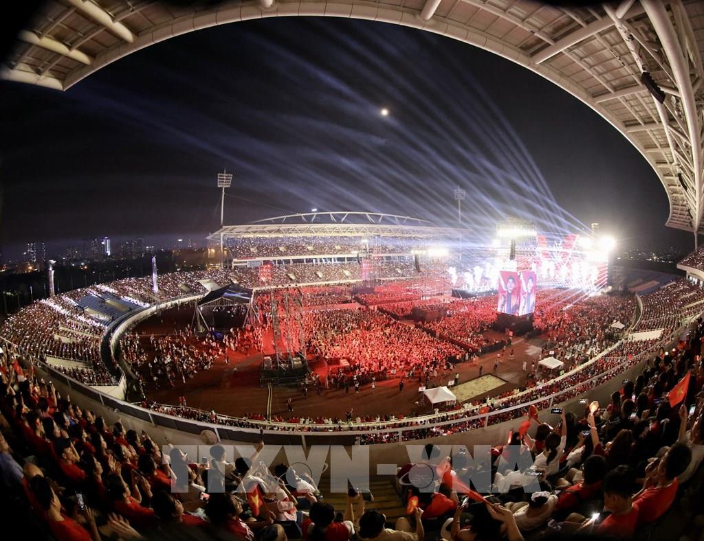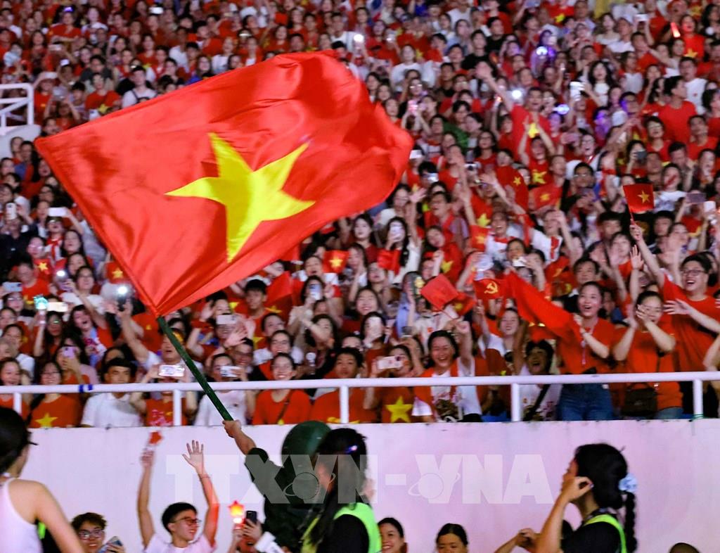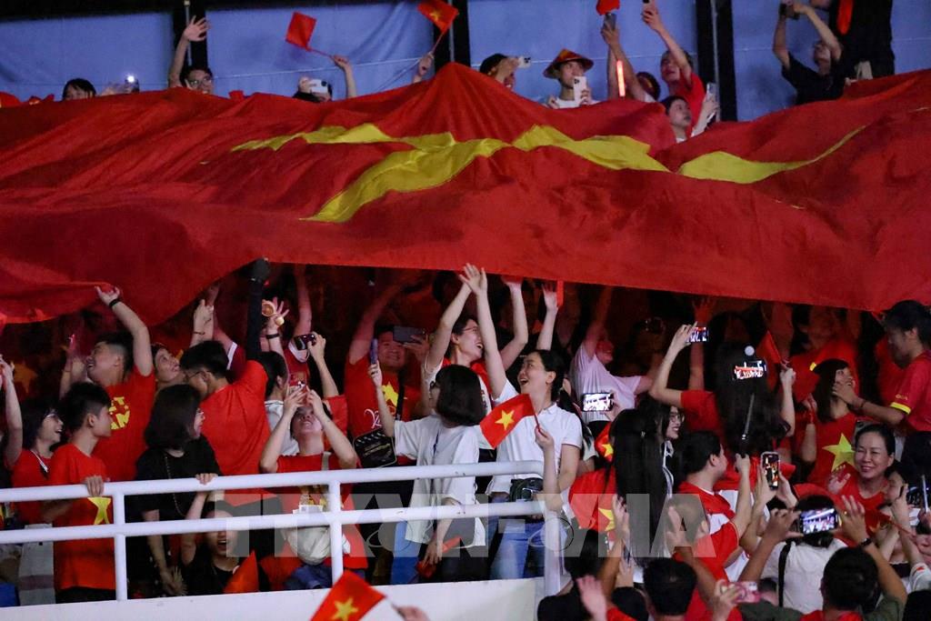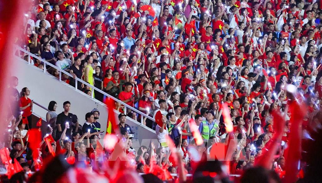 Cả khán đài chung nhịp đập cùng hòa vang bài Tiến quân ca. Ảnh: TTXVN
