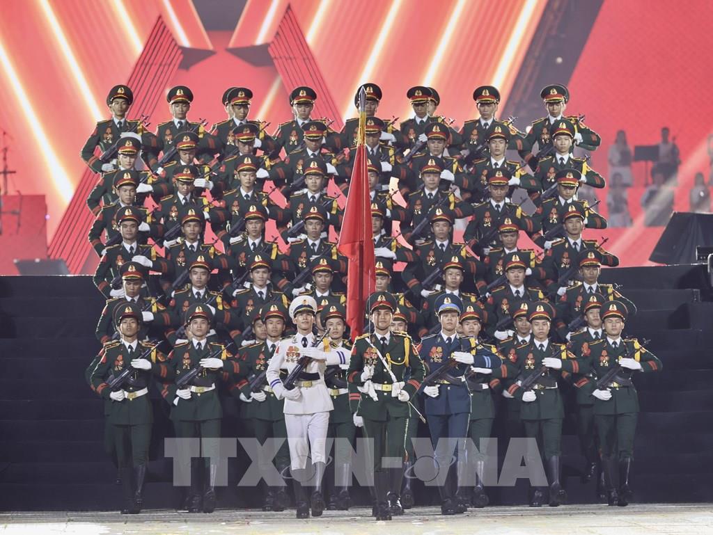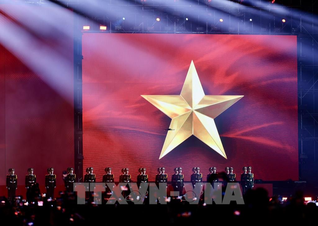 “Tổ quốc trong tim” tái hiện các dấu mốc lịch sử của đất nước gắn với hình ảnh lá cờ đỏ sao vàng, biểu tượng thiêng liêng của lòng yêu nước và khát vọng dân tộc. Ảnh: Nhật Anh - TTXVN
