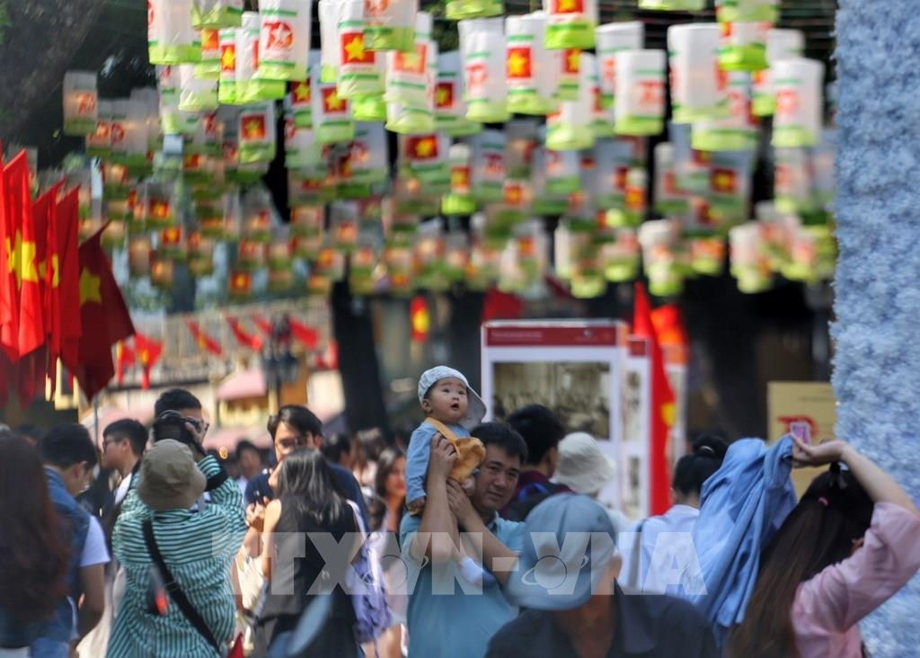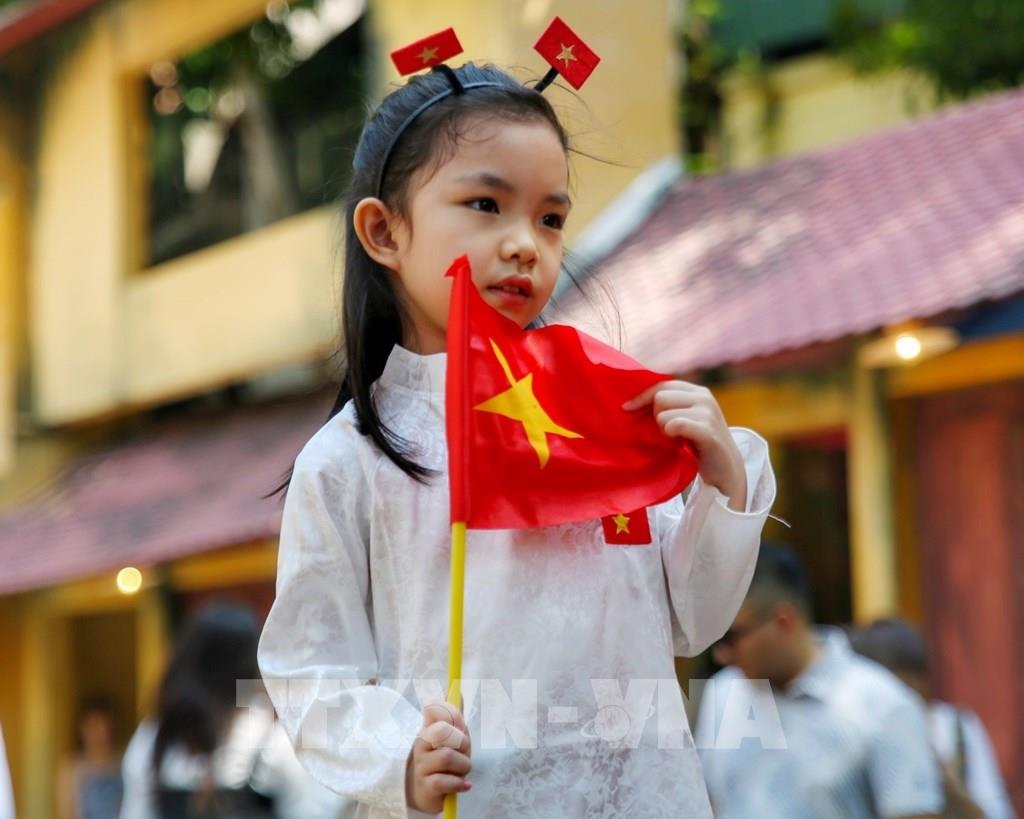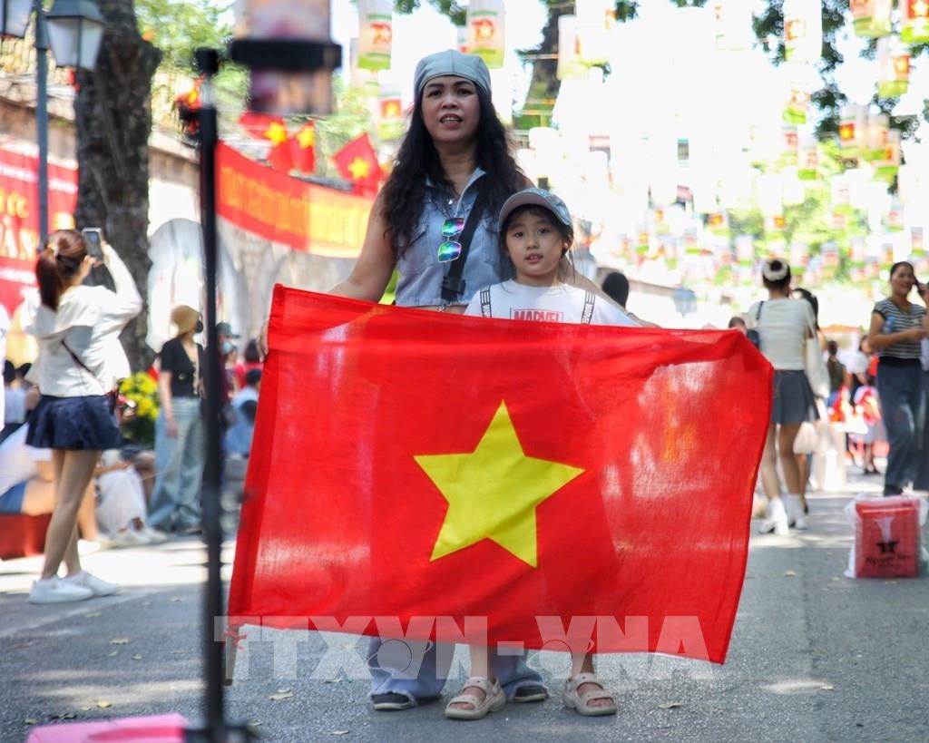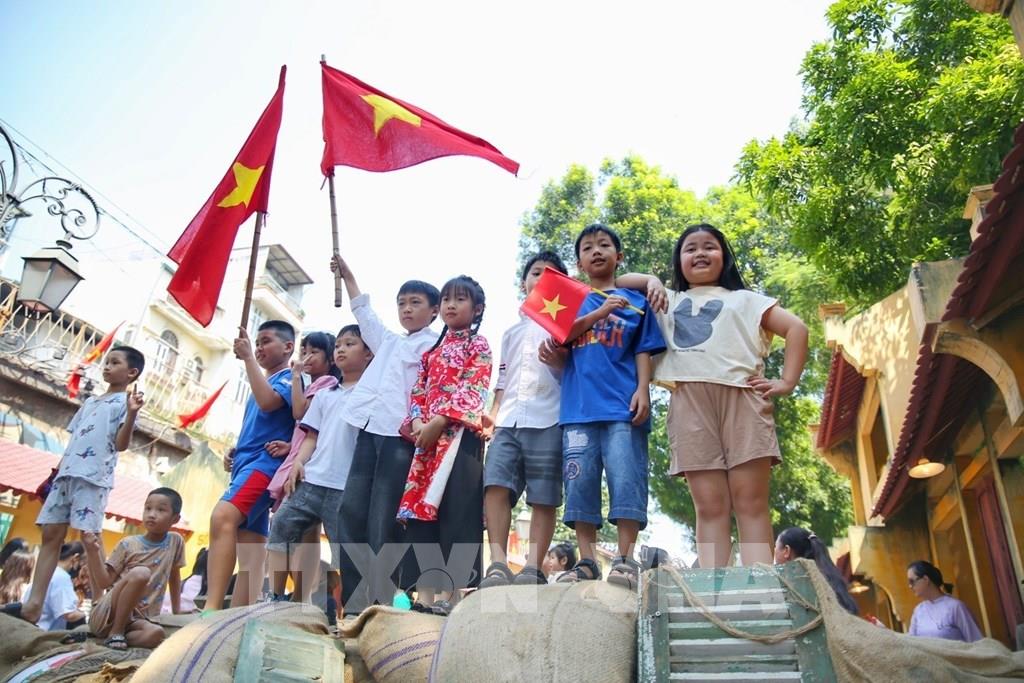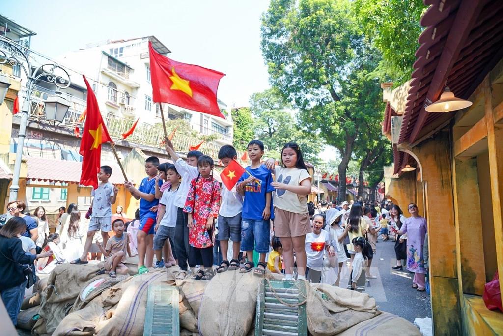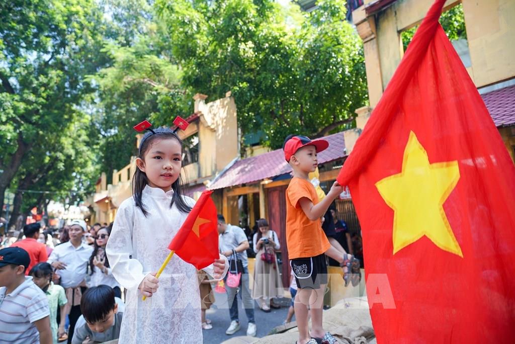 Các em nhỏ chụp ảnh cùng Quốc kỳ tại phố Phùng Hưng. Ảnh: Khánh Hòa - TTXVN