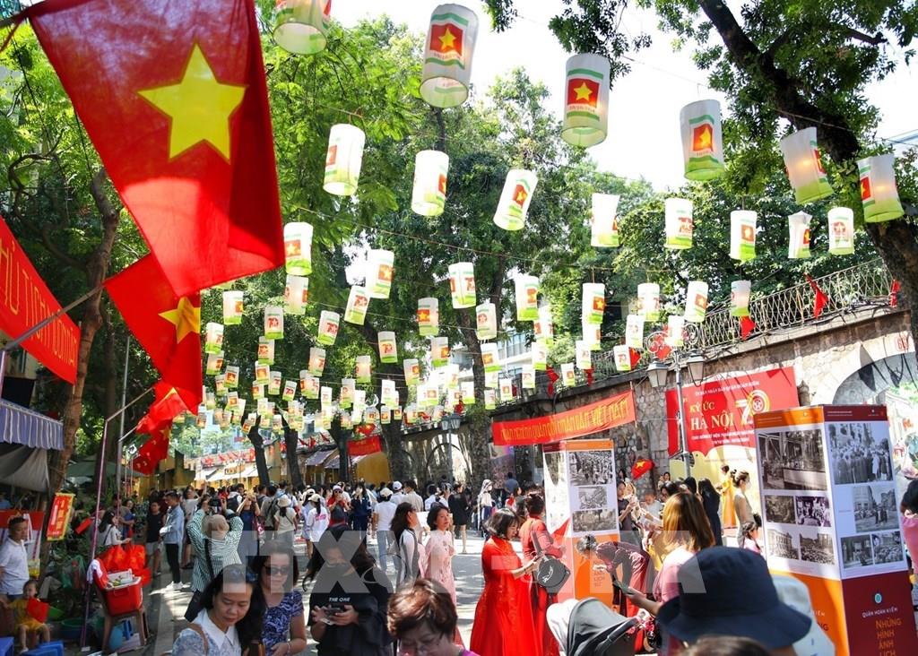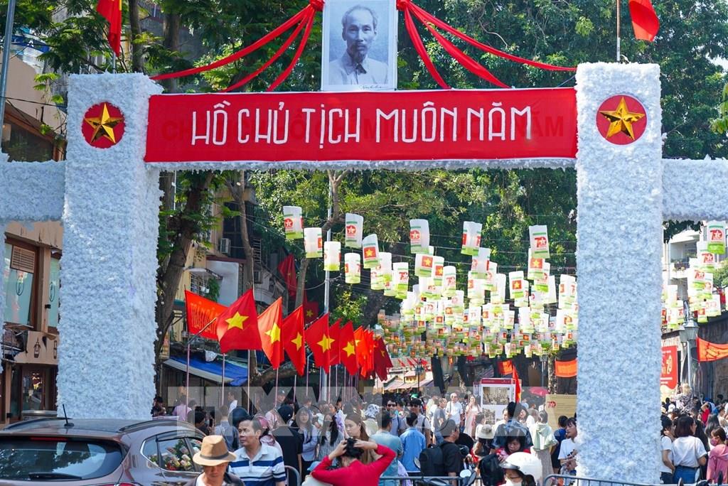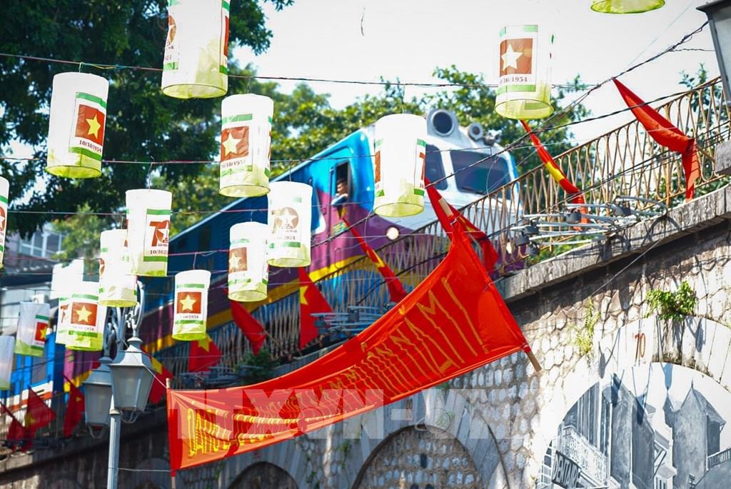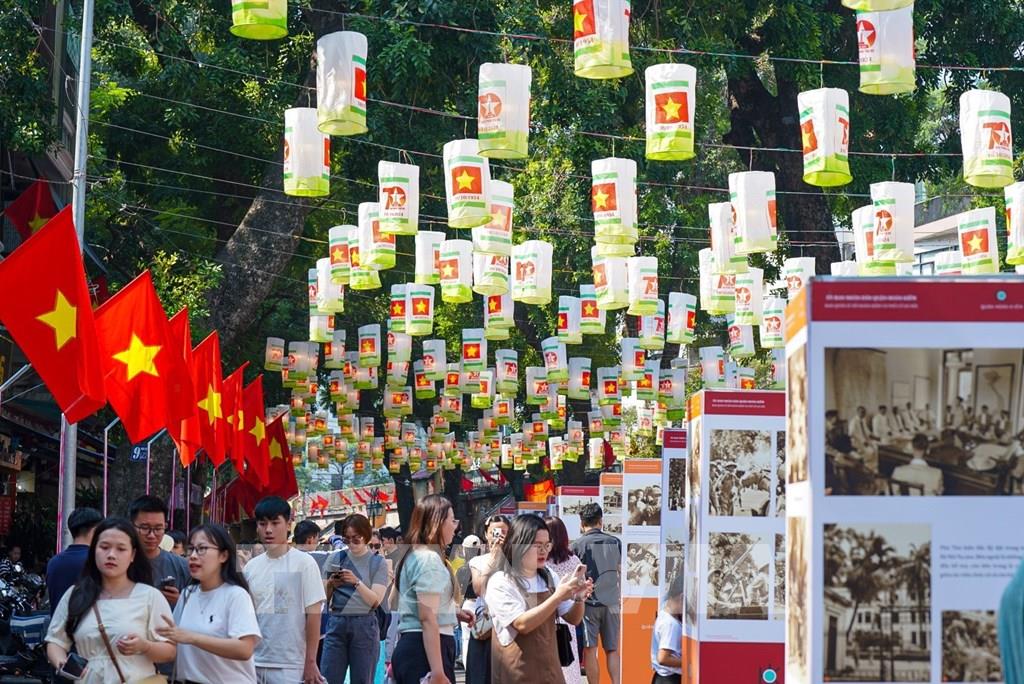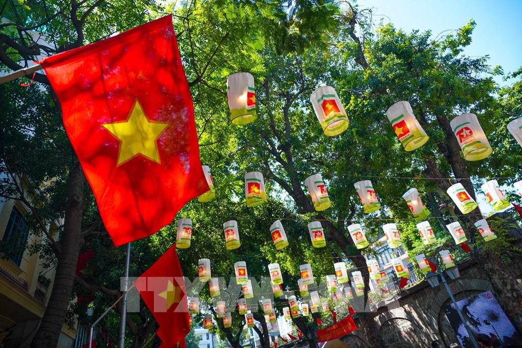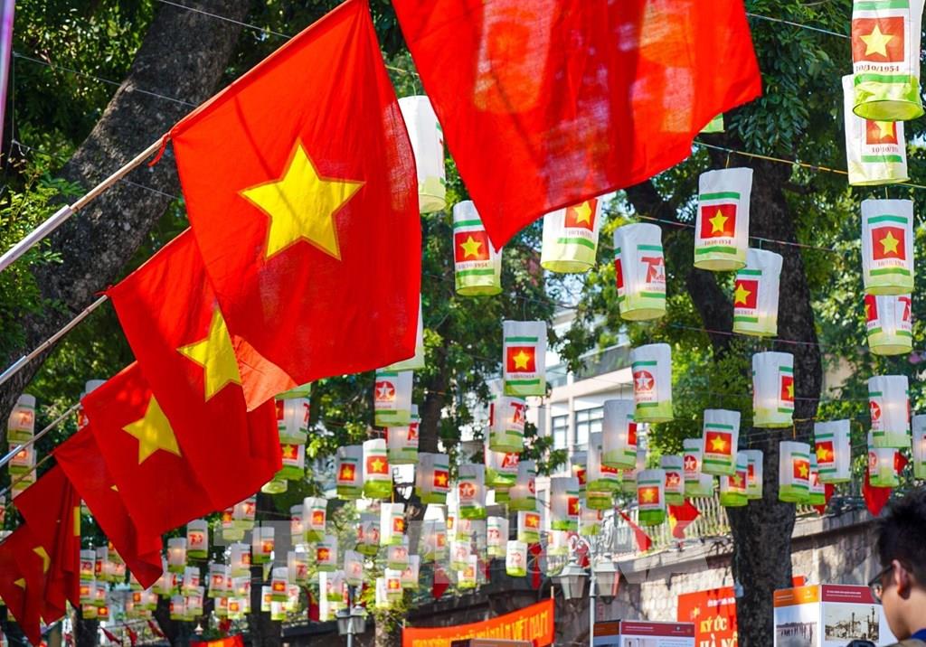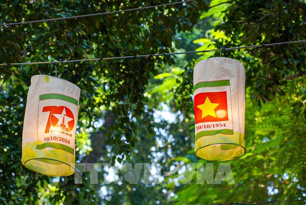 Phố Phùng Hưng rực rỡ cờ hoa chào mừng 70 năm Giải phóng Thủ đô. Ảnh: Khánh Hòa - TTXVN