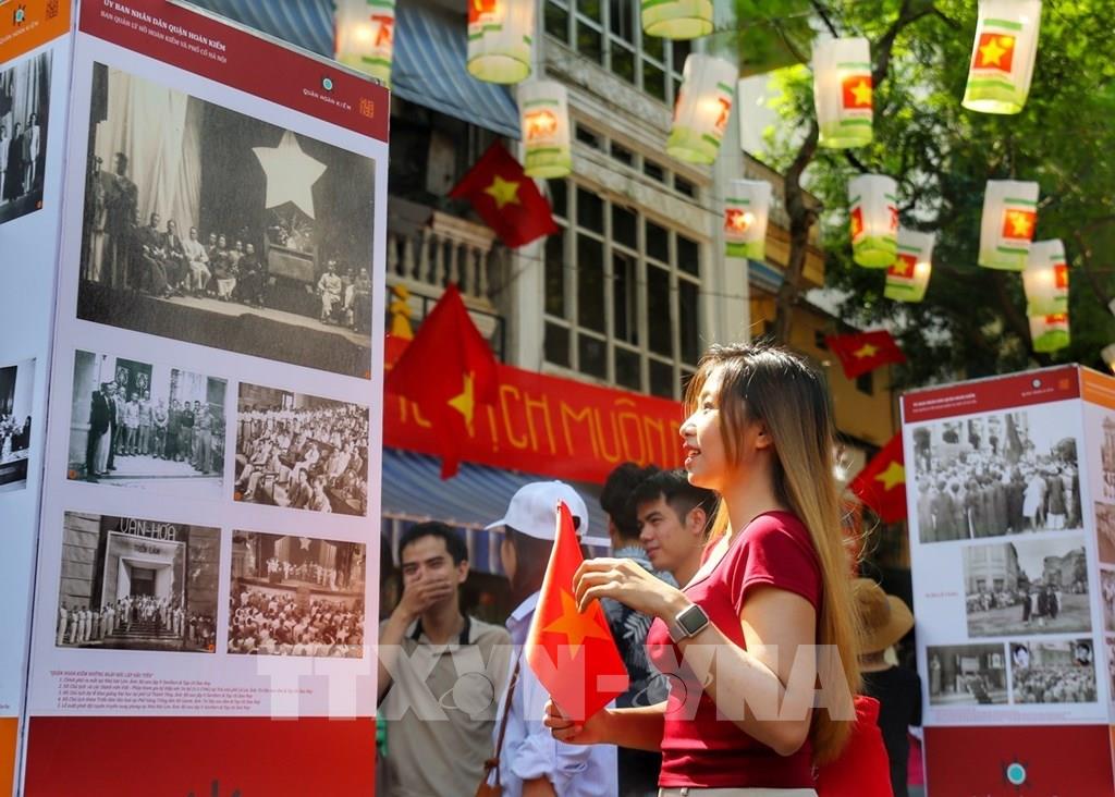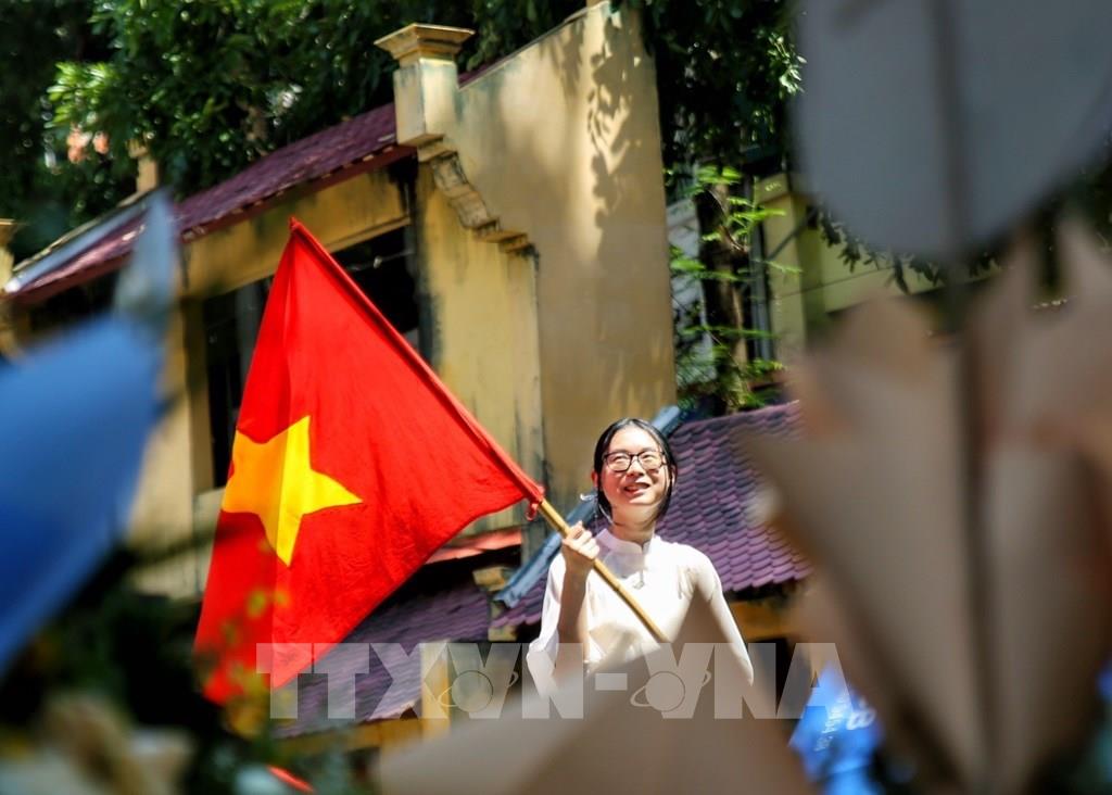Các bạn trẻ phấn khích chụp ảnh cùng Quốc kỳ tại phố Phùng Hưng. Ảnh: Tuấn Đức - TTXVN