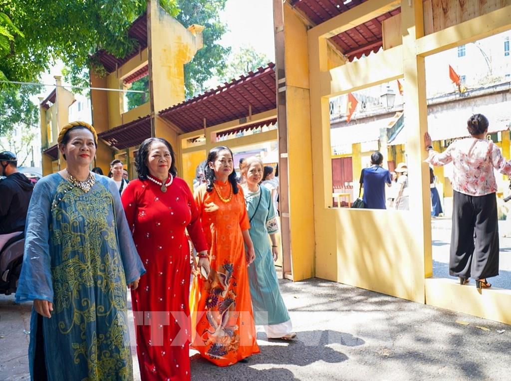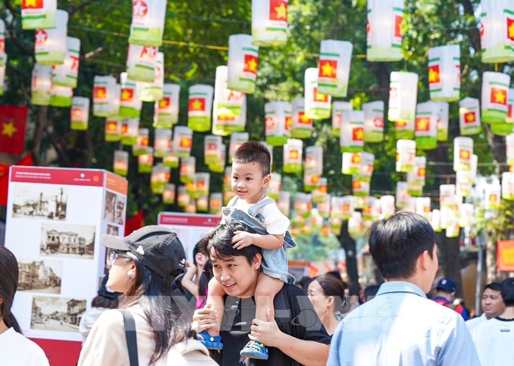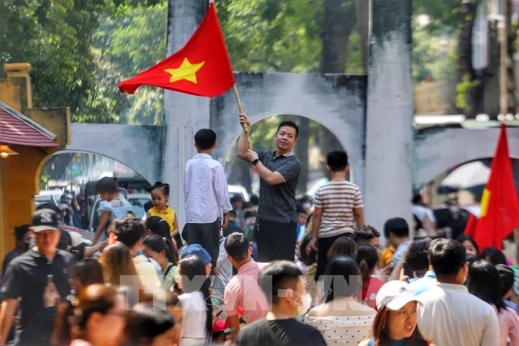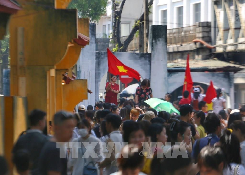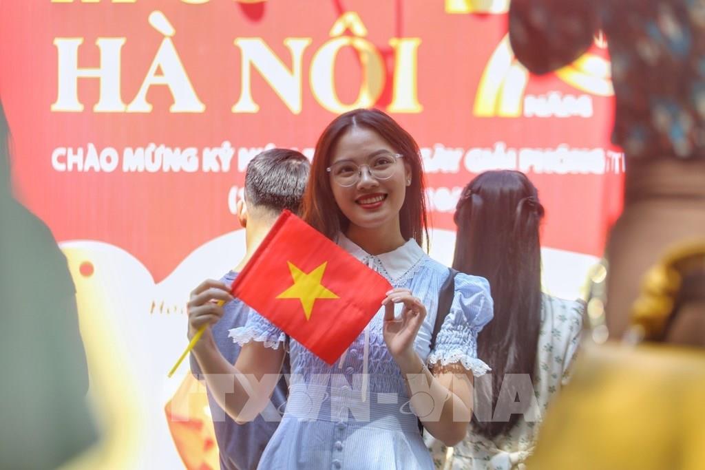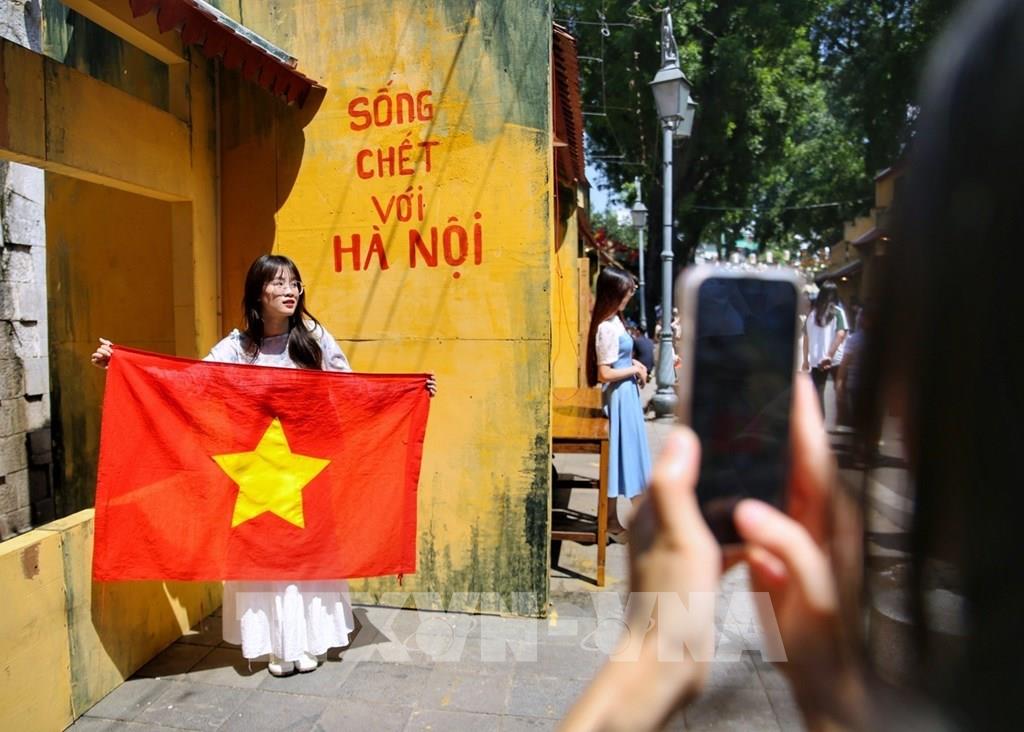 Người dân chụp ảnh với Quốc kỳ tại Không gian Bích họa Phùng Hưng. Ảnh: Tuấn Đức - TTXVN