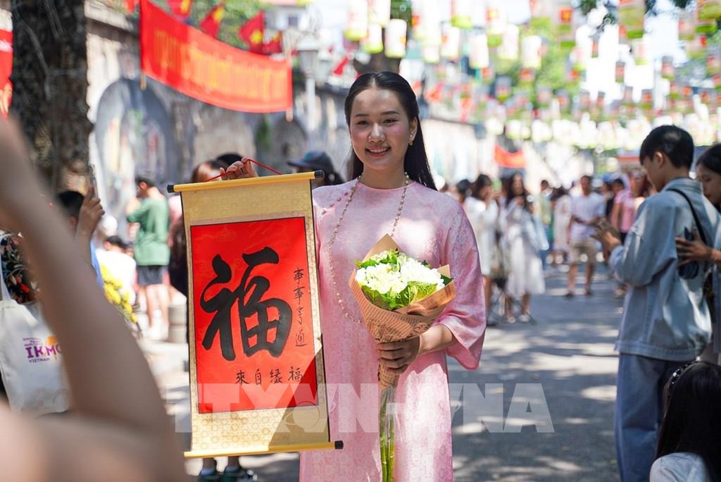 Các bạn trẻ tranh thủ chụp những hình ảnh lưu niệm tại phố Phùng Hưng. Ảnh: Khánh Hòa - TTXVN