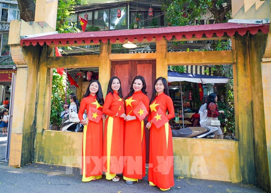 Các bạn trẻ chụp ảnh cùng Quốc kỳ tại phố Phùng Hưng. Ảnh: Tuấn Đức - TTXVN