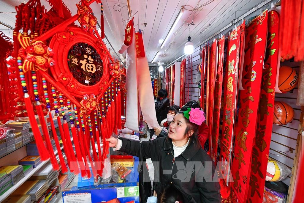 Người dân chọn mua đồ trang trí Tết Nguyên đán tại Kaili, tỉnh Quý Châu, Trung Quốc ngày 30/1/2022. Ảnh: THX/TTXVN