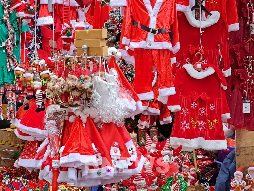 Bộ đồ ông già Noel dao động từ 100.000 đồng đến 250.000 đồng/bộ. Ảnh: Bạch Diệp/BNEWS