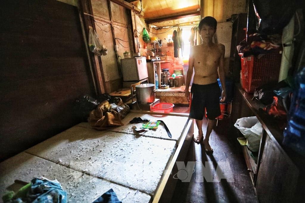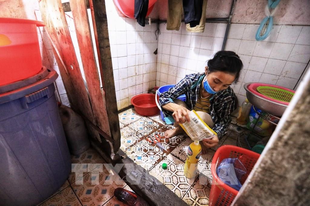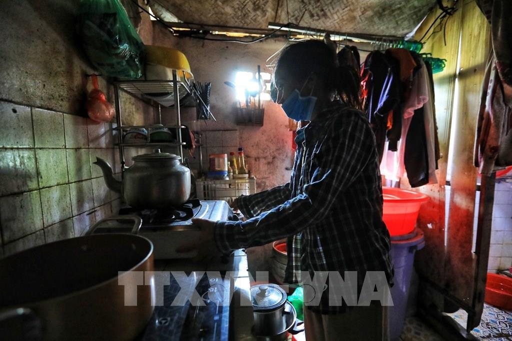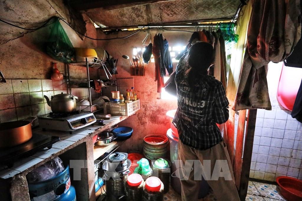 Chị Hương hằng ngày vẫn phải sinh hoạt giặt giũ, bếp núc trong căn hộ nửa nhà nửa gỗ này. Ảnh: Thành Đạt - TTXVN
