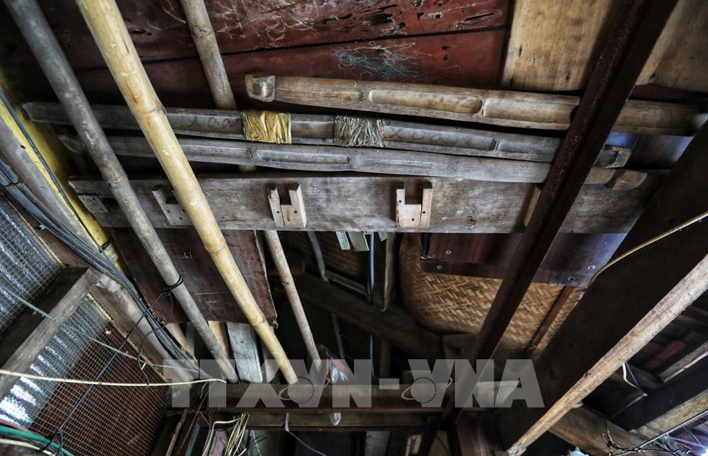 Theo thời gian, phần mái nhà đã bị hư hỏng, xuống cấp trầm trọng, chỉ chờ sập xuống. Người dân dùng cả đòn gánh, thanh gỗ để chống đỡ. Ảnh: Thành Đạt - TTXVN