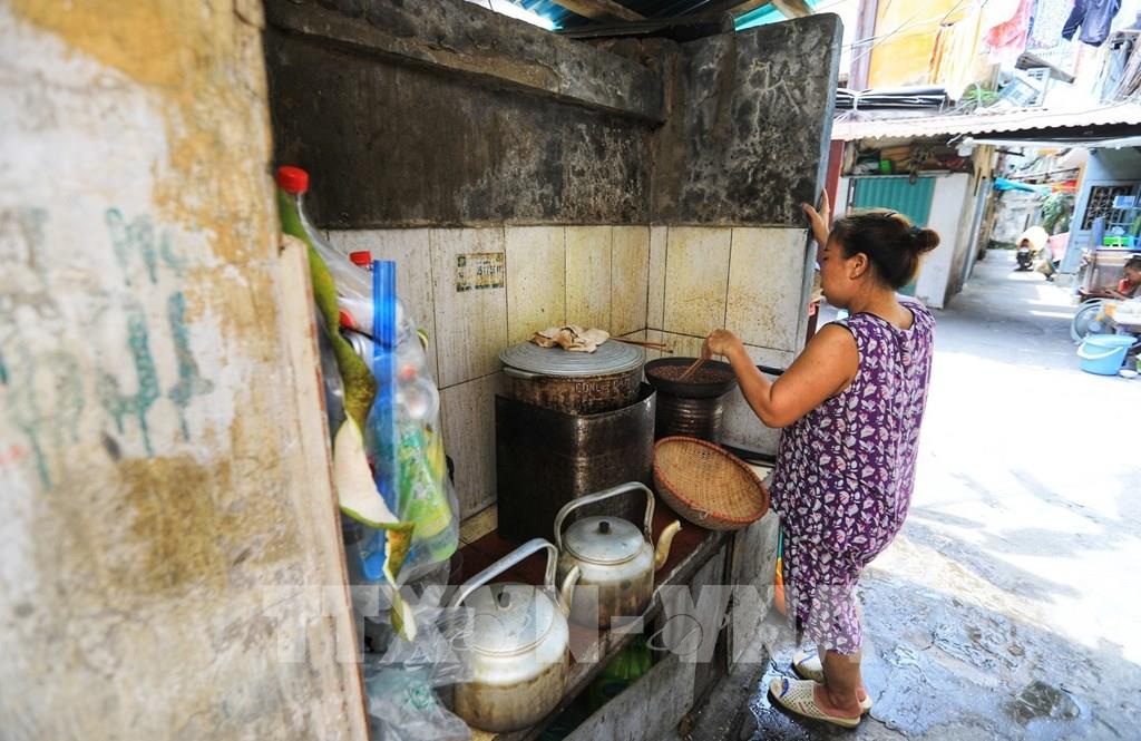 Hàng chục năm nay, những hộ dân dưới tầng 1 vẫn phải nấu ăn ngoài trời vì trong nhà là trần gỗ rất nguy hiểm có thể xảy ra hỏa hoạn bất cứ lúc nào. Ảnh: Thành Đạt - TTXVN