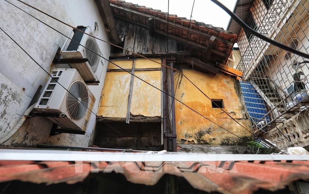 Người dân sống lâu năm ở phố Vọng Hà cho biết, khu nhà gỗ được xây dựng từ năm 1955, đến nay đang xuống cấp nghiêm trọng, tiềm ẩn nhiều nguy hiểm, khiến người dân sống ở đây không khỏi lo lắng. Ảnh: Thành Đạt - TTXVN