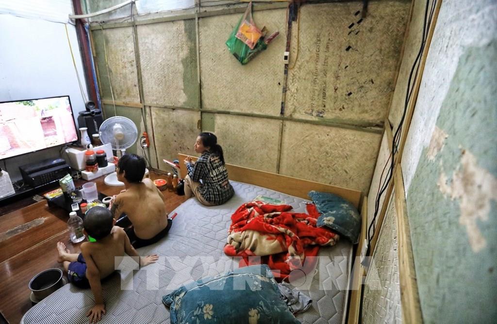Gia đình anh Đạt, chị Hương sống trong căn hộ được lợp bằng phên nứa, rất dễ bắt lửa trong mùa nắng nóng. Ảnh: Thành Đạt - TTXVN