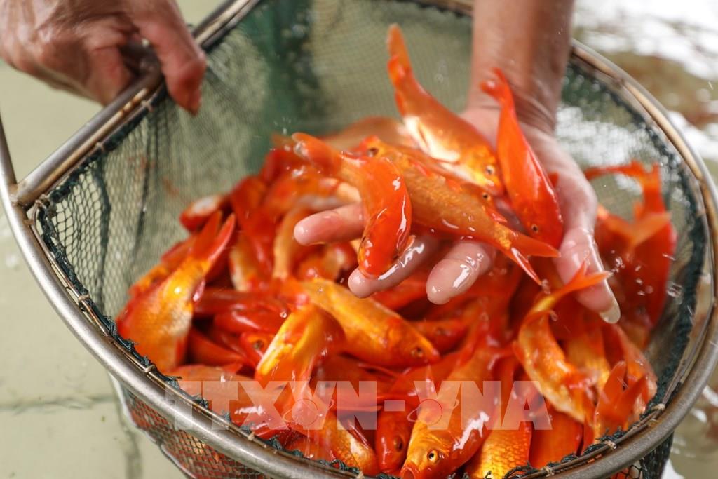 Thông thường cá giống sẽ được nuôi từ tháng 6, chăm sóc đến khi cá thu hoạch có kích cỡ khoảng 3 ngón tay là vừa đẹp. Cá ở đây có kích cỡ vừa phải, khỏe, màu đỏ tươi hoặc vàng, vây nhọn, vẩy ánh đẹp, có râu hai bên nên được thị trường ưa chuộng. Ảnh: Minh Quyết - TTXVN