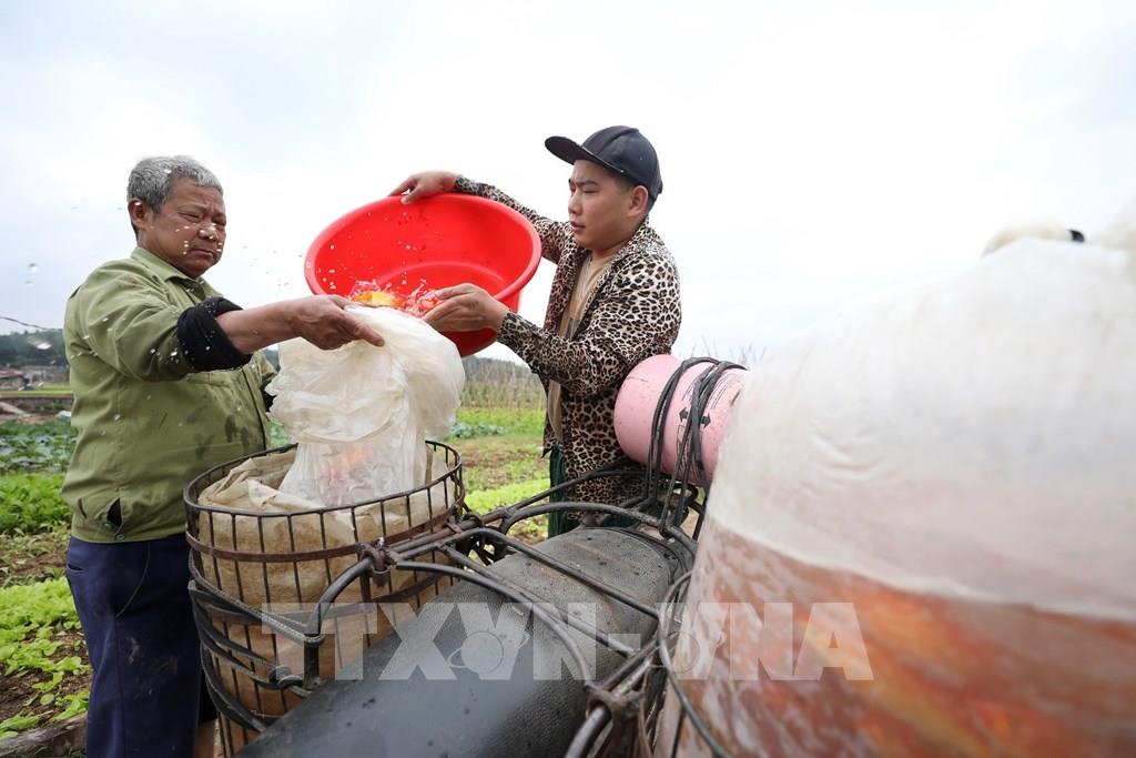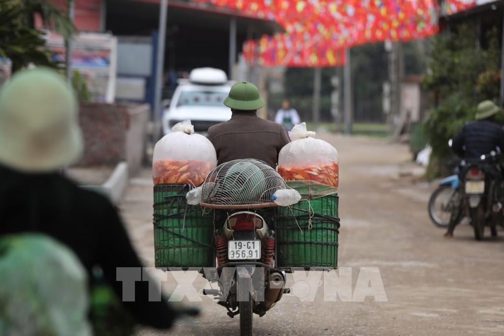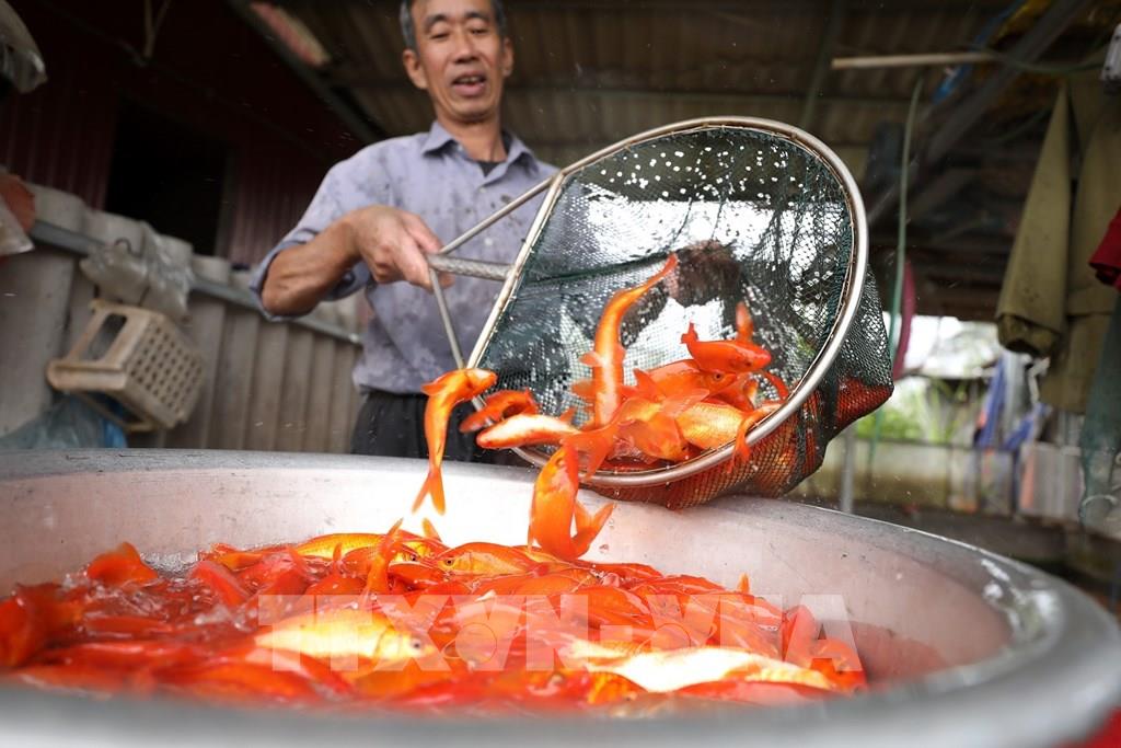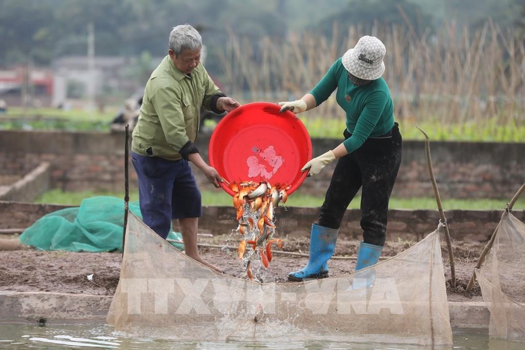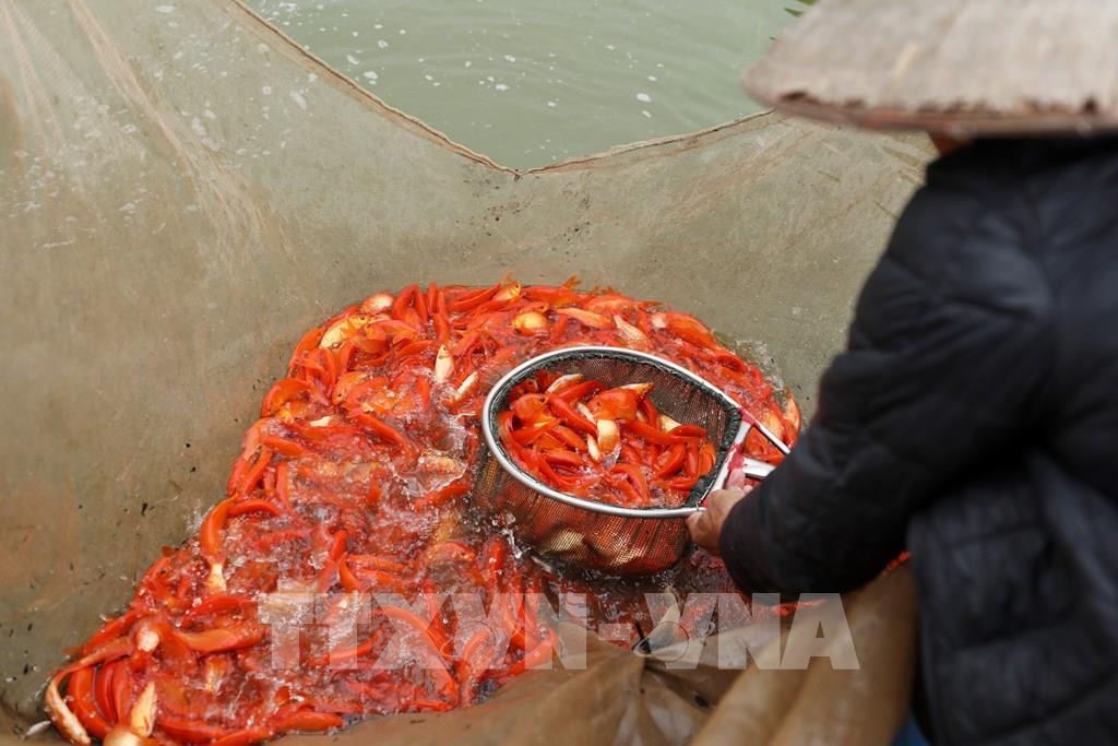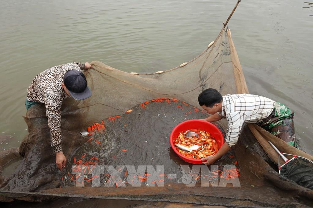 Những ngày này, người dân làng nuôi cá chép đỏ Thủy Trầm, xã Tuy Lộc, huyện Cẩm Khê (Phú Thọ) nhộn nhịp chuẩn bị thu hoạch cá phục vụ nhu cầu tín ngưỡng của nhân dân trong ngày Tết ông Công, ông Táo. Ảnh: Minh Quyết – TTXVN