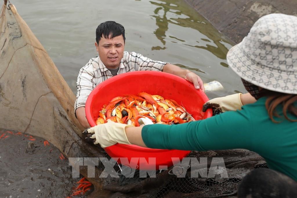 Hộ gia đình ông Nguyễn Danh Đích làng Thủy Trầm thu hoạch cá chép đỏ chuyển đến các tỉnh miền Bắc, chuẩn bị cho Tết ông Công ông Táo. Ảnh: Minh Quyết - TTXVN