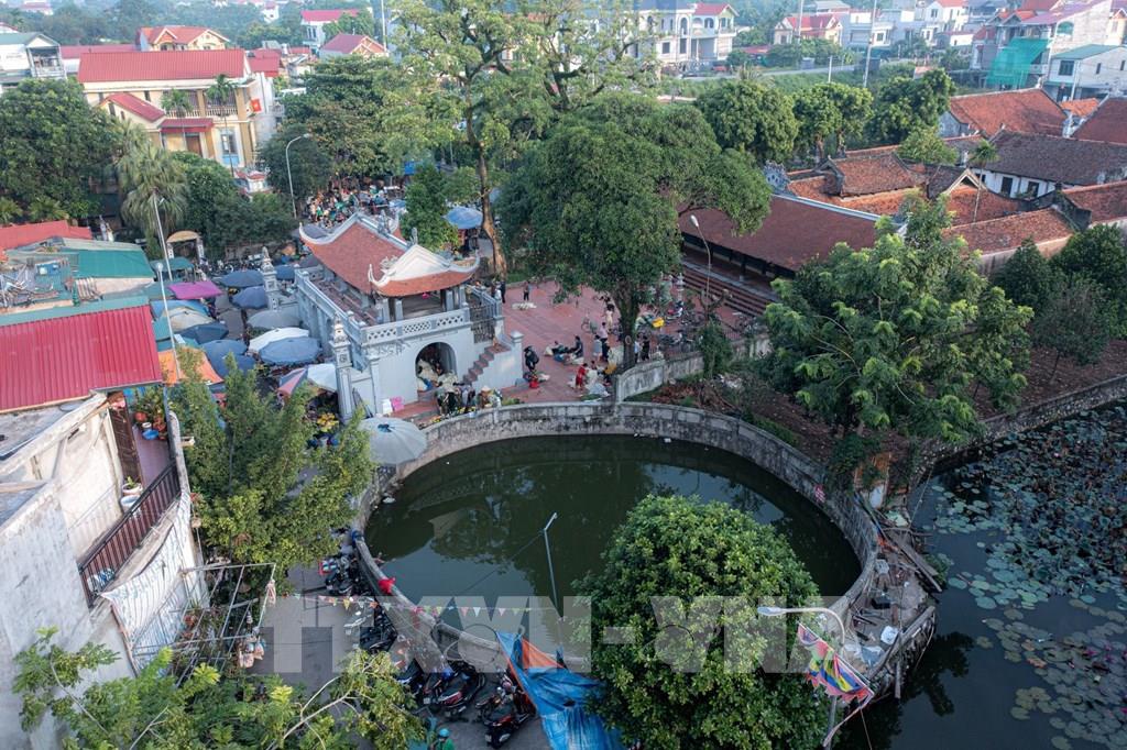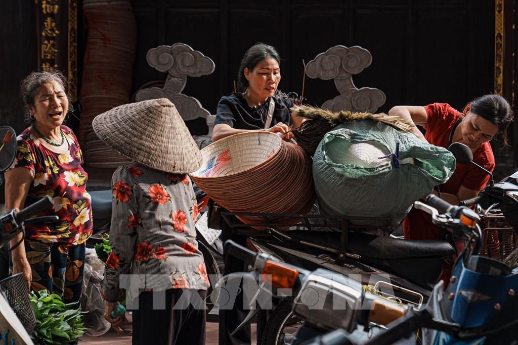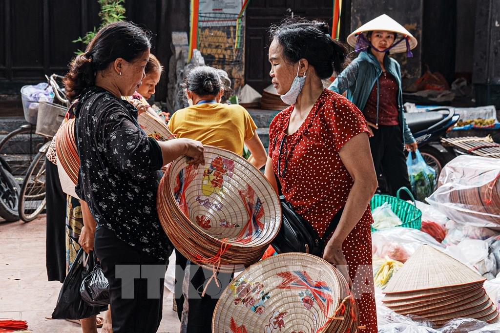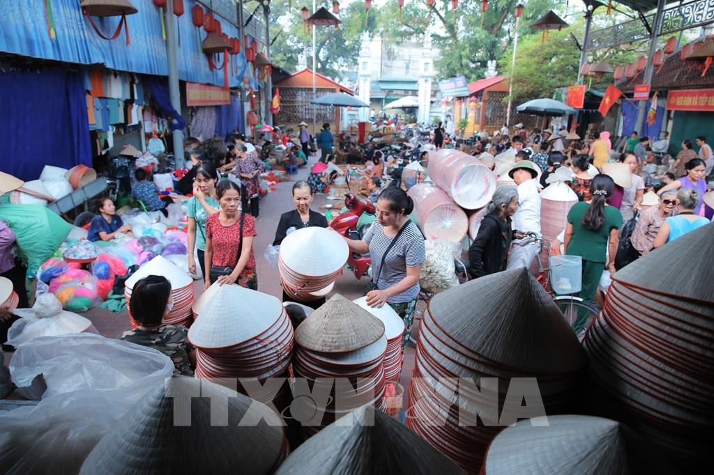 Phiên chợ làng Chuông họp vào các ngày 4, 10, 14, 20, 24, 30 âm lịch hằng tháng. Từ lâu, chợ phiên đã trở thành một nếp sống, một nét văn hóa đặc trưng của ngôi làng cổ hàng trăm năm tuổi nổi tiếng với nghề làm nón lá. Ảnh: Ngọc Liên-TTXVN