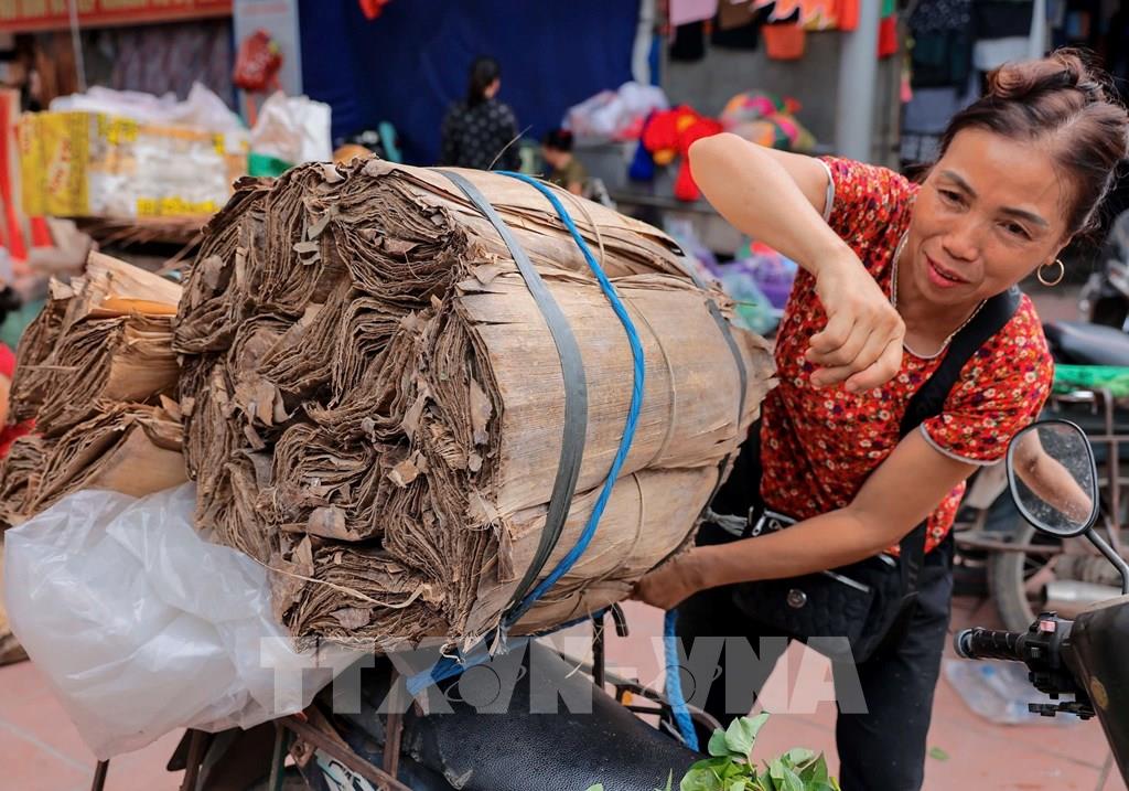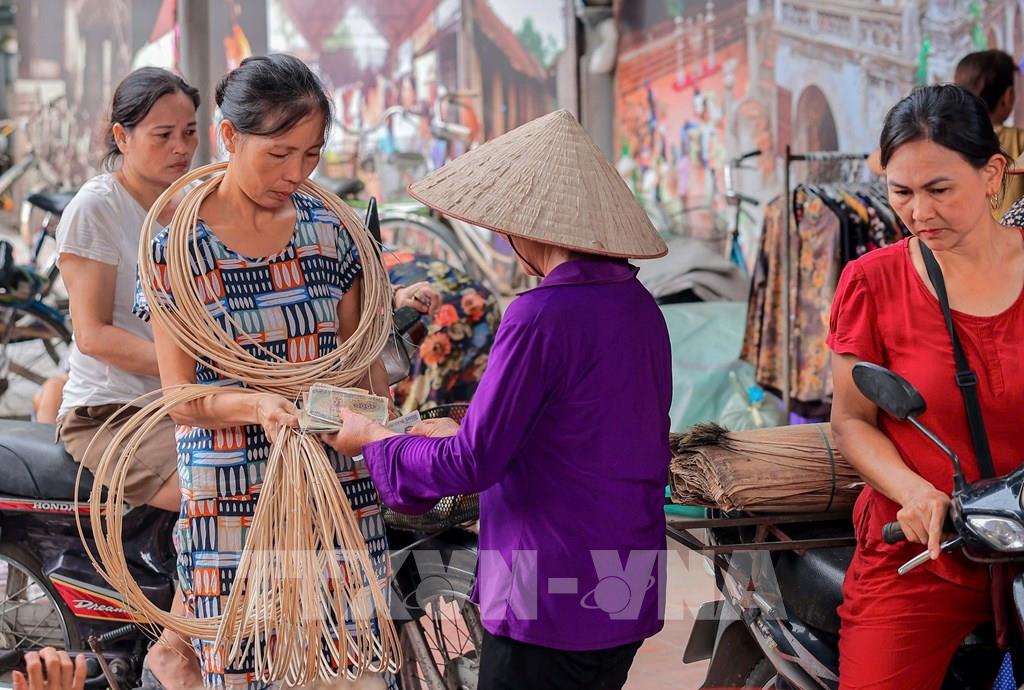 Chợ phiên làng Chuông bán tất cả các nguyên vật liệu làm nón. Ảnh: Hoàng Hiếu-TTXVN