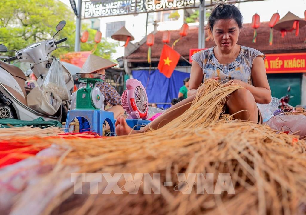 Chợ phiên làng Chuông không chỉ bán nón mà còn bán tất cả các nguyên vật liệu để làm nón. Ảnh: Hoàng Hiếu-TTXVN