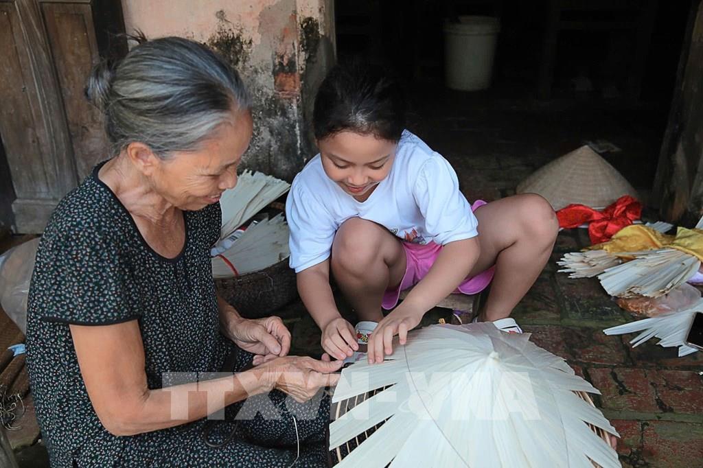 Bà Phạm Thị Liên hướng dẫn cháu gái rải lá trên khuôn. Công đoạn này tuy đơn giản nhưng yêu cầu sự khéo léo và kinh nghiệm để đảm bảo khung nón đều, chắc chắn, và có hình dáng đẹp. Ảnh: Ngọc Liên-TTXVN