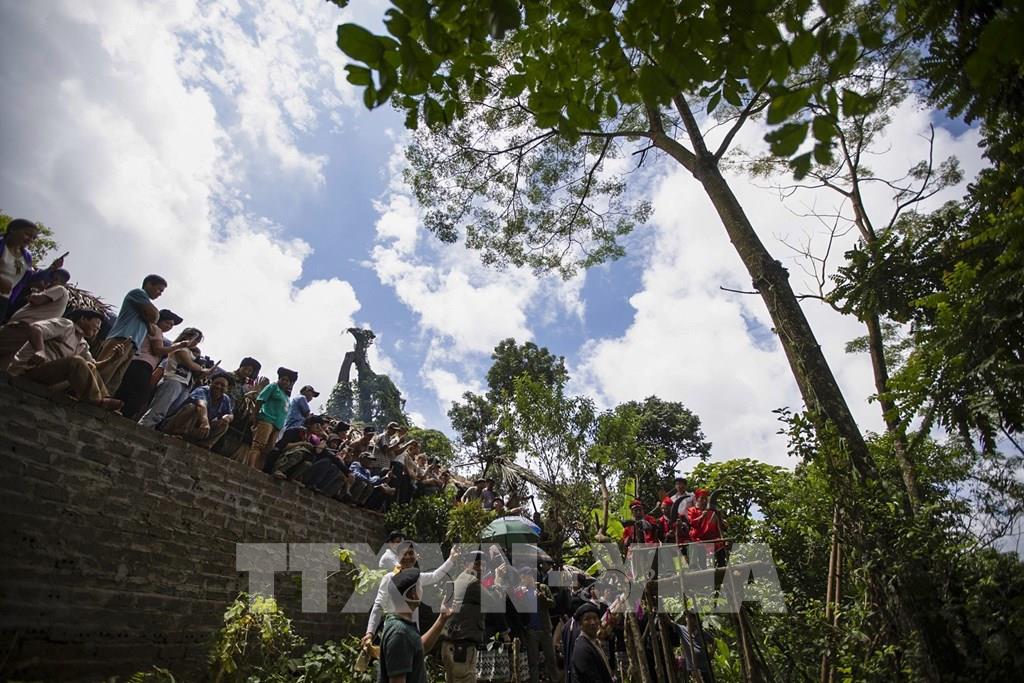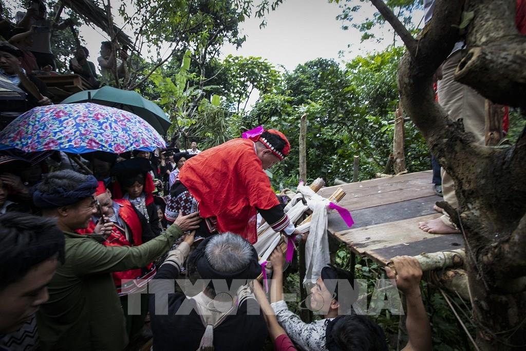 Thầy cúng bước lên bậc thang làm bằng các lưỡi dao quắm đặt chéo nhau lên ngũ đài để cúng giải hạn, xóa điều xấu, đón điều tốt về cho dòng họ. Ảnh: Trọng Đạt - TTXVN