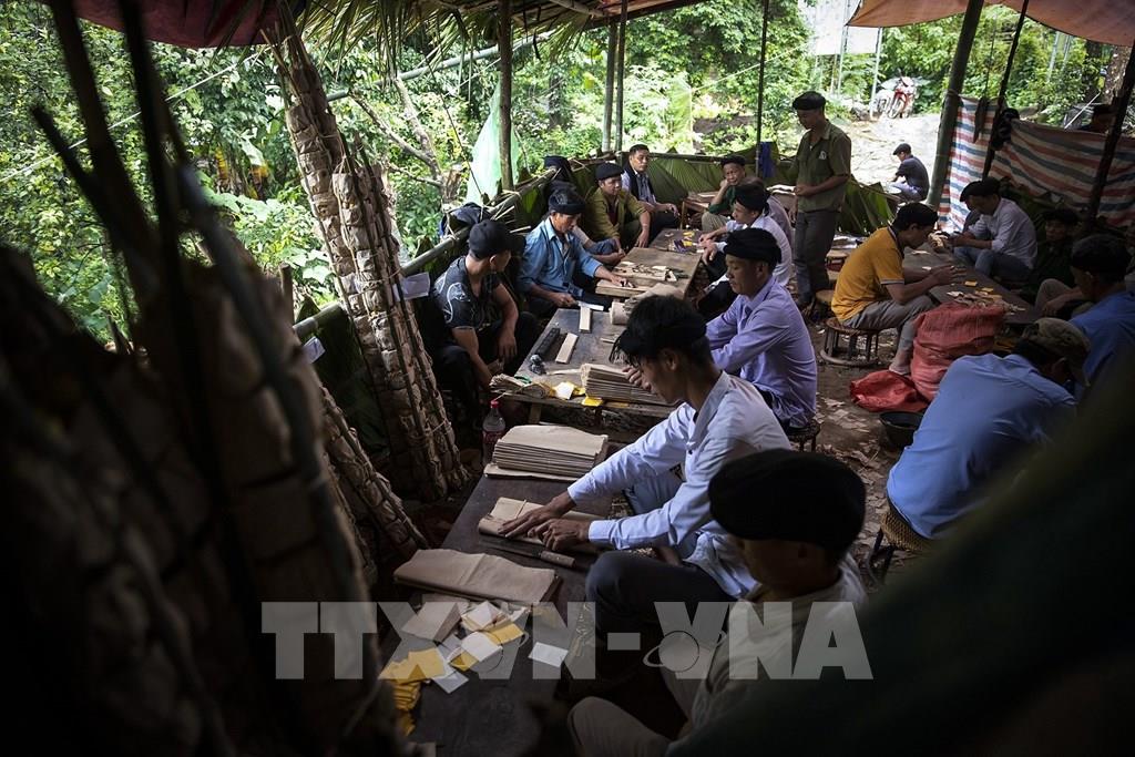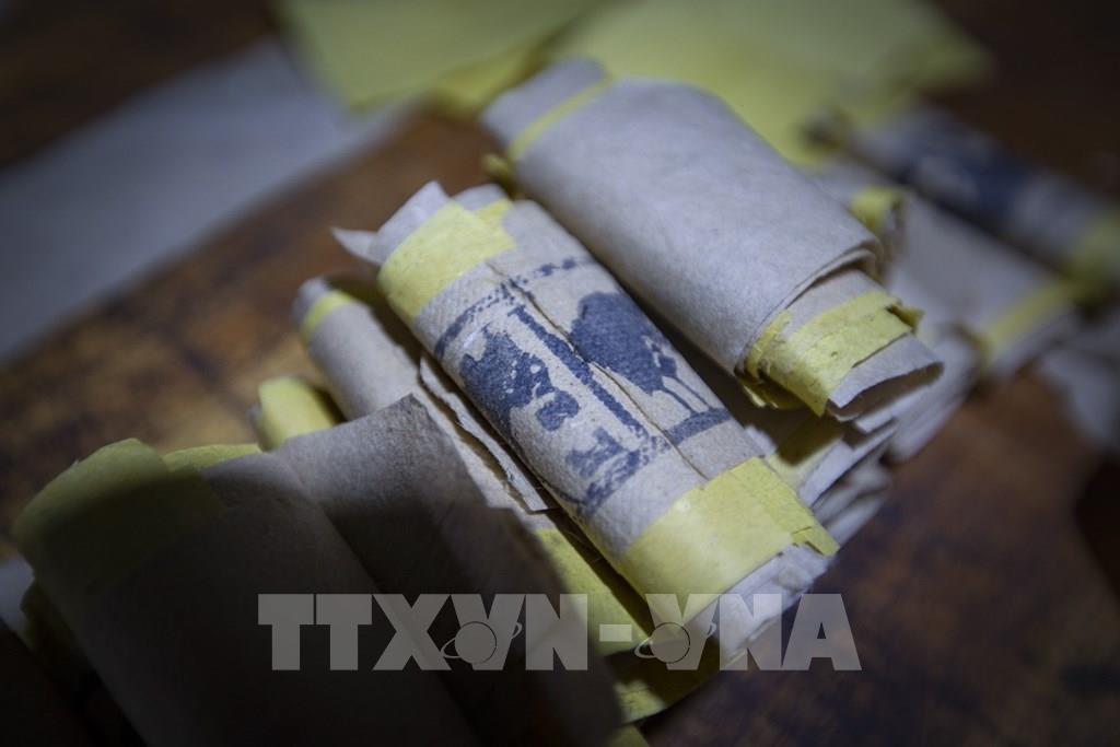 Tiền mã dùng để cúng lễ cần 1.100 bó, mỗi bó 18 cuộn tiền, mỗi cuộn được gấp từ tờ giấy in có 6 con ngựa và 6 tờ tiền. Ảnh: Trọng Đạt - TTXVN